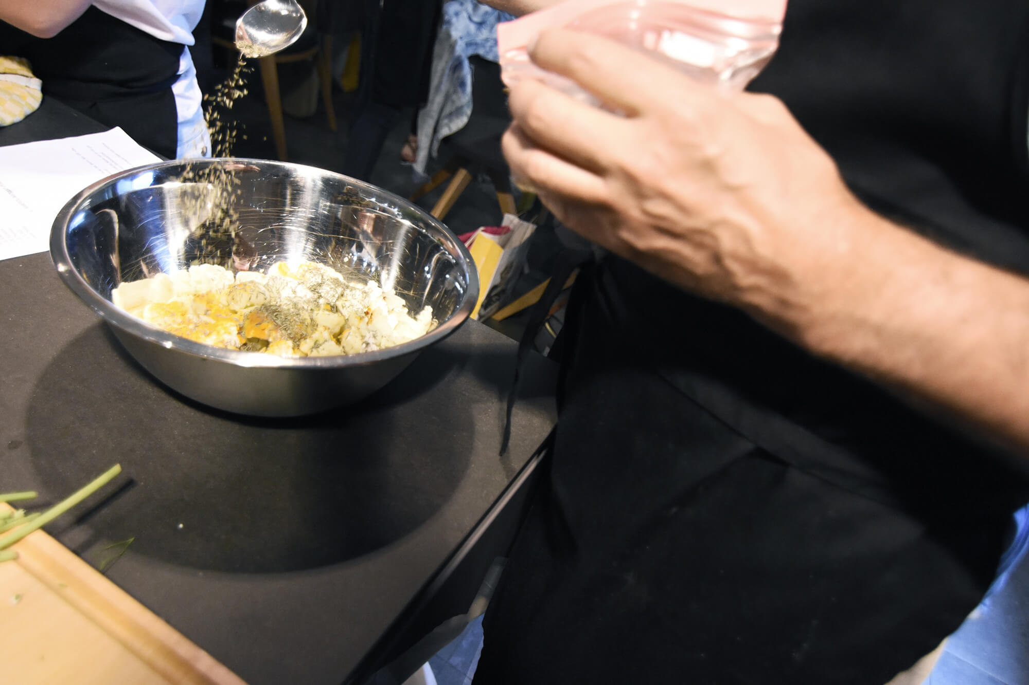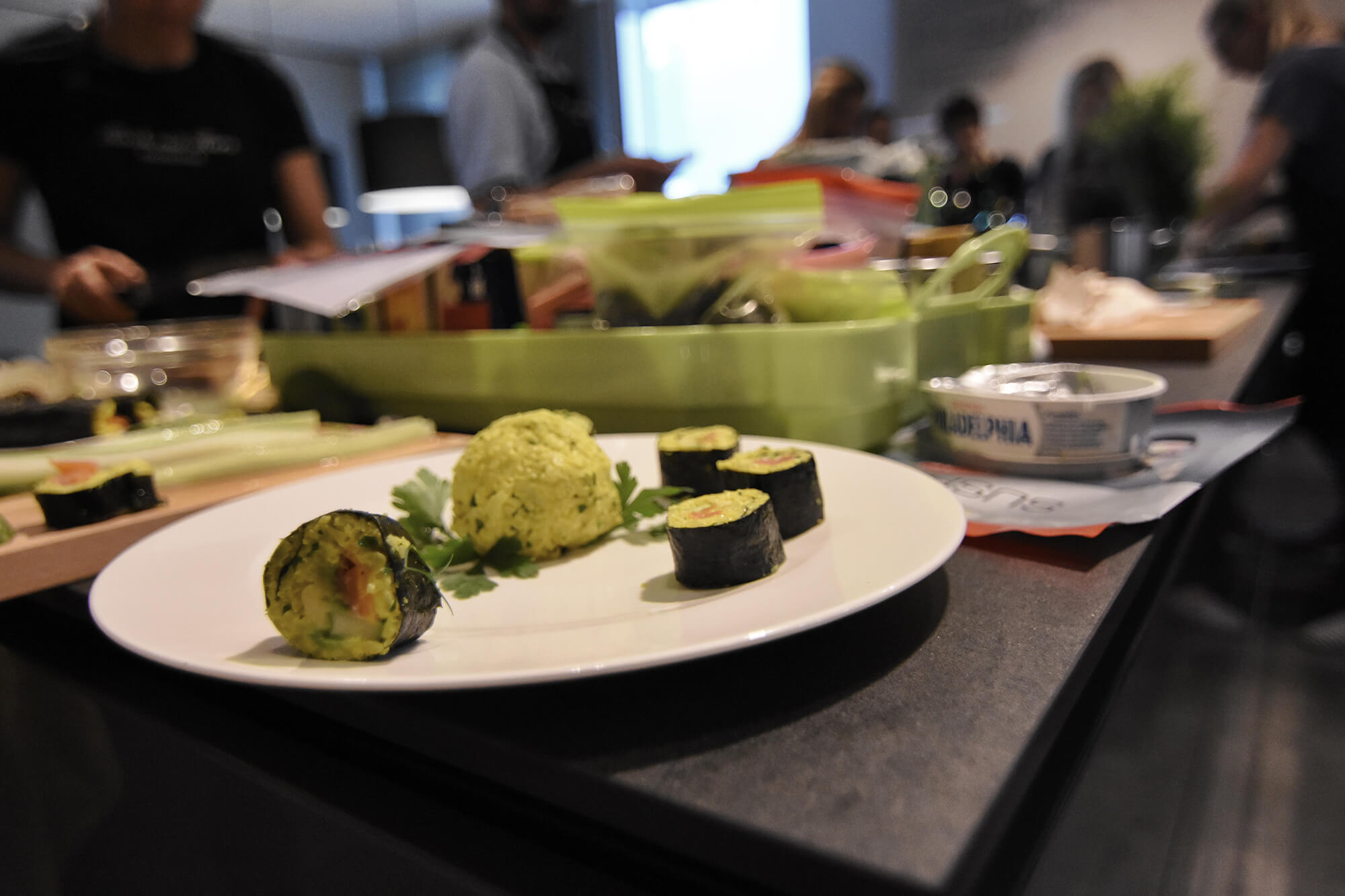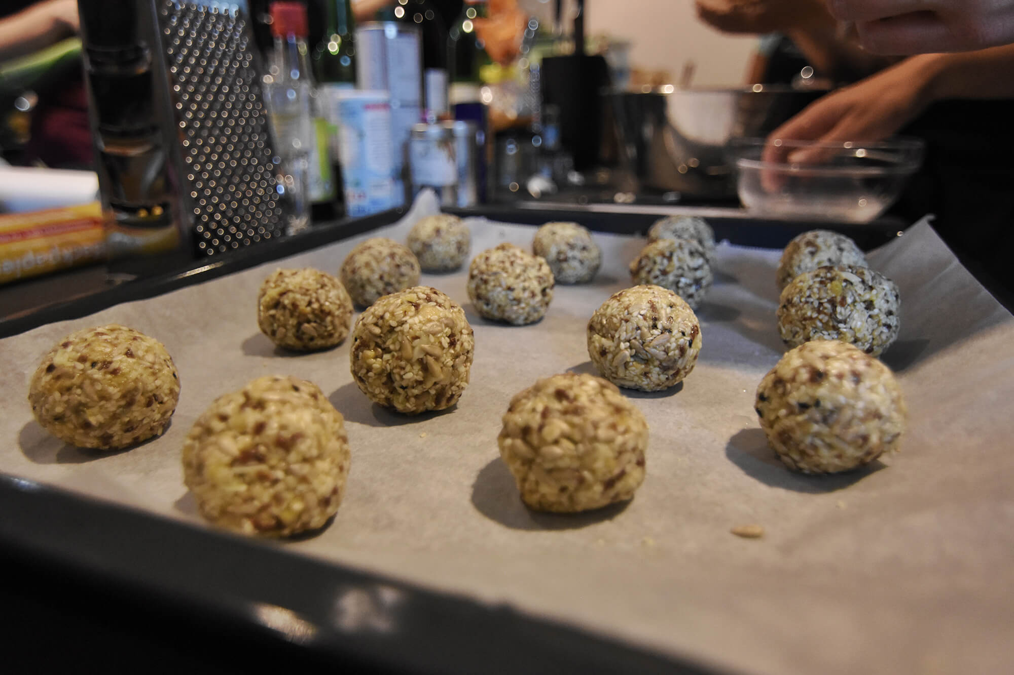 Der Mann mit Bodybuilder-Statur und seine ebenso athletische Begleitung machen sich ans Sushi ohne Reis. Liebevolle Zuwendung von einem Ehepaar bekommt das fette Rumpsteak. Es wird mit Dijon Senf eingerieben, gesalzen und gepfeffert. Drei gesellige Mädels, die eigens aus Wien angereist sind, widmen sich den Low-Carb-Marillen-Cupcakes und zwei andere Teilnehmerinnen bereiten die Vorspeise zu: einen frischen Gurkensalat mit Topfen-Kräuter-Bällchen. Zwei durchtrainierte Rennradfahrerinnen rollen emsig kleine Kügelchen, die sie zu verlockenden Crackern platt drücken.