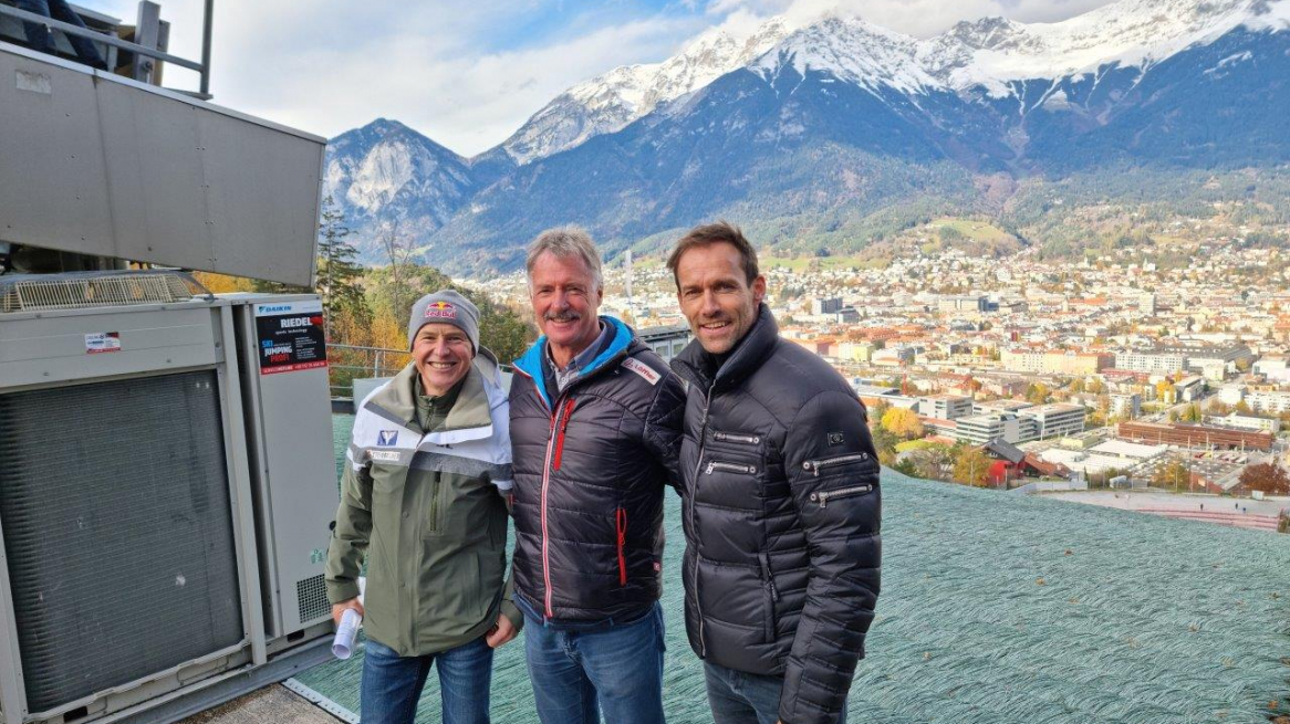 Alfons Schranz wird von Andi Goldberger und dem legendären ersten Vierfachsieger der Tournee, Sven Hannawald (rechts) in die Mitte genommen. Bild: Privat/Alfons Schranz