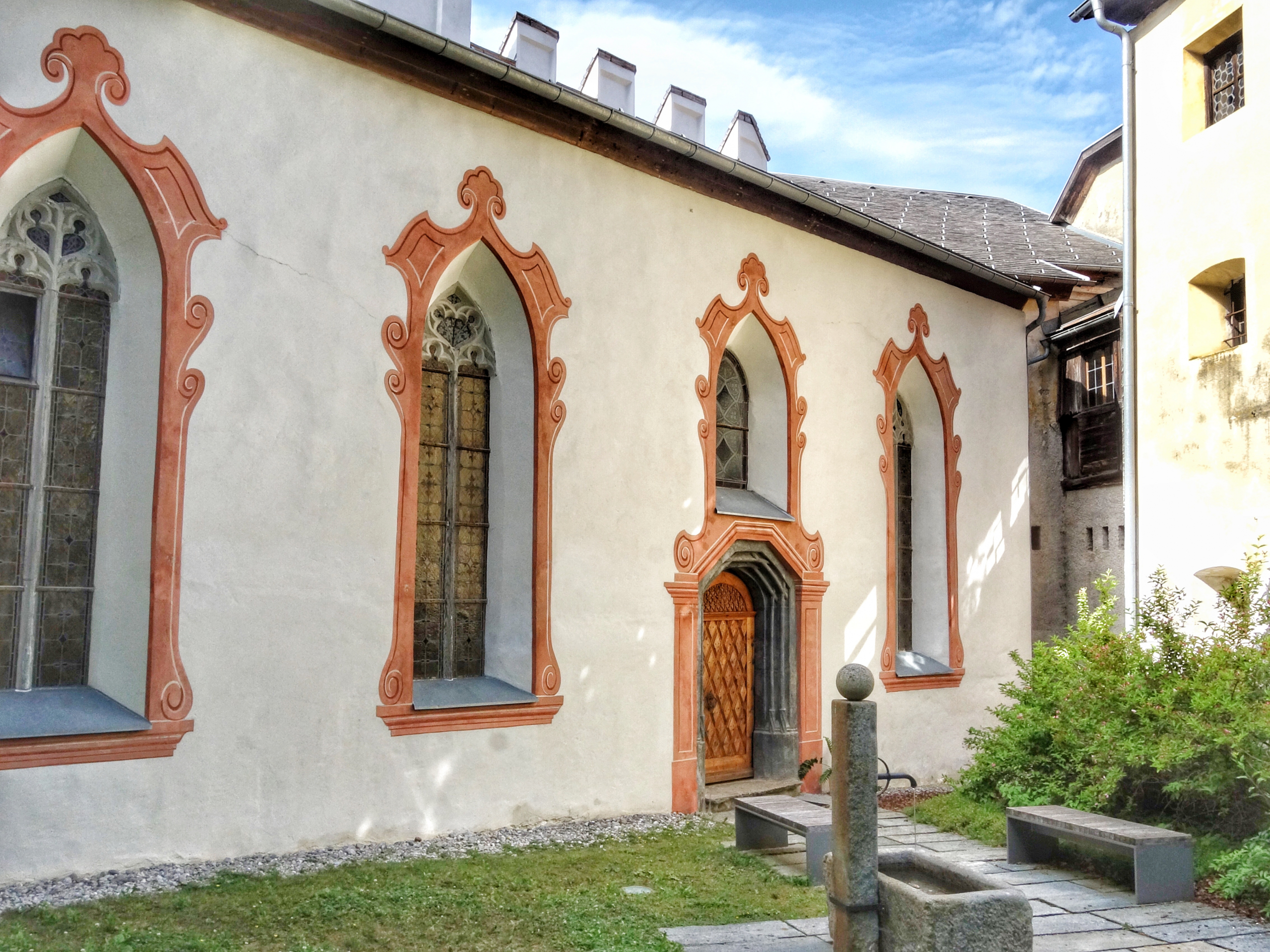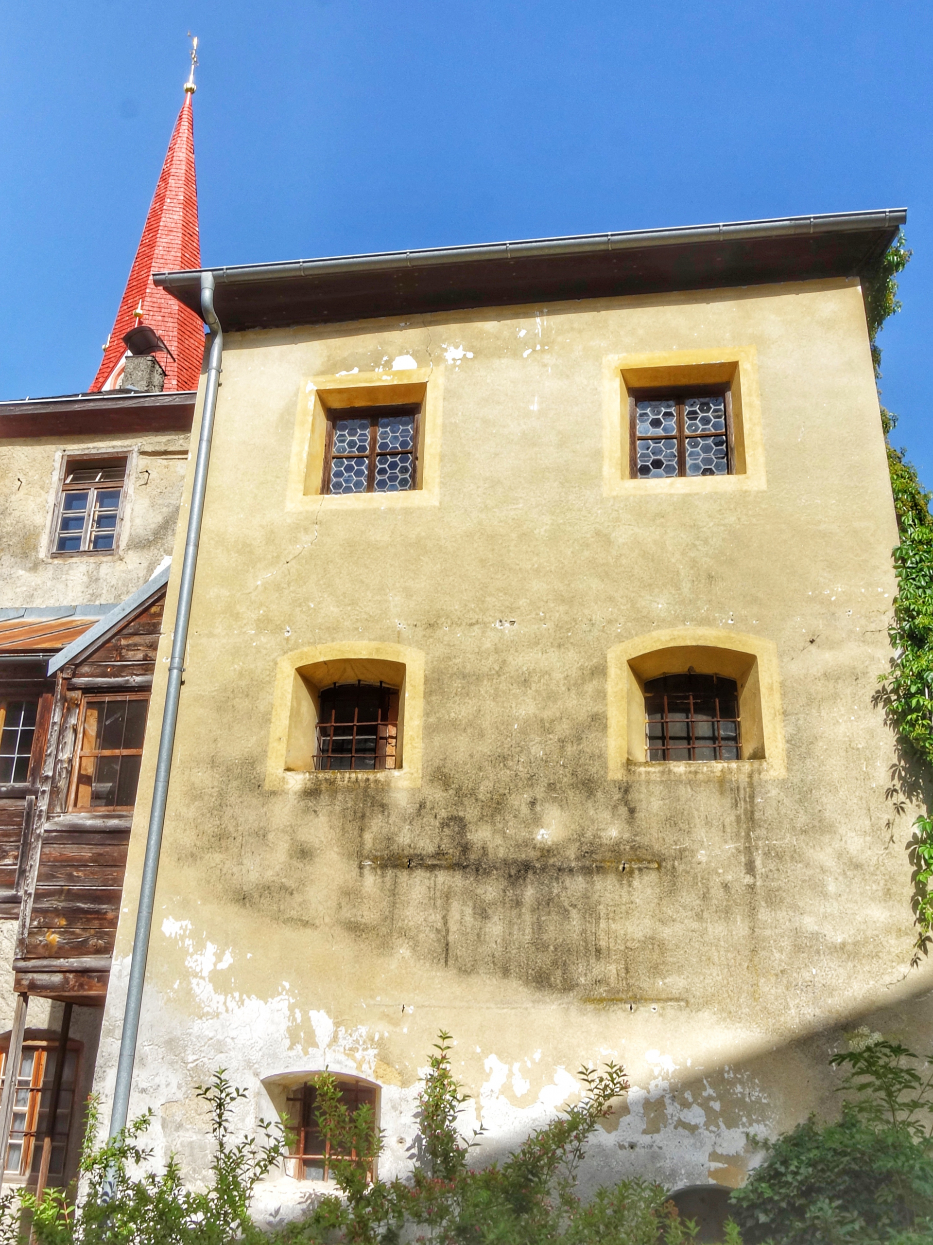 Das Ris-Schlössl in Flaurling, Westseite. Links im Bild die Ris-Kapelle mit den Spitzbogenfenstern. Rechts das Kaplanhaus.