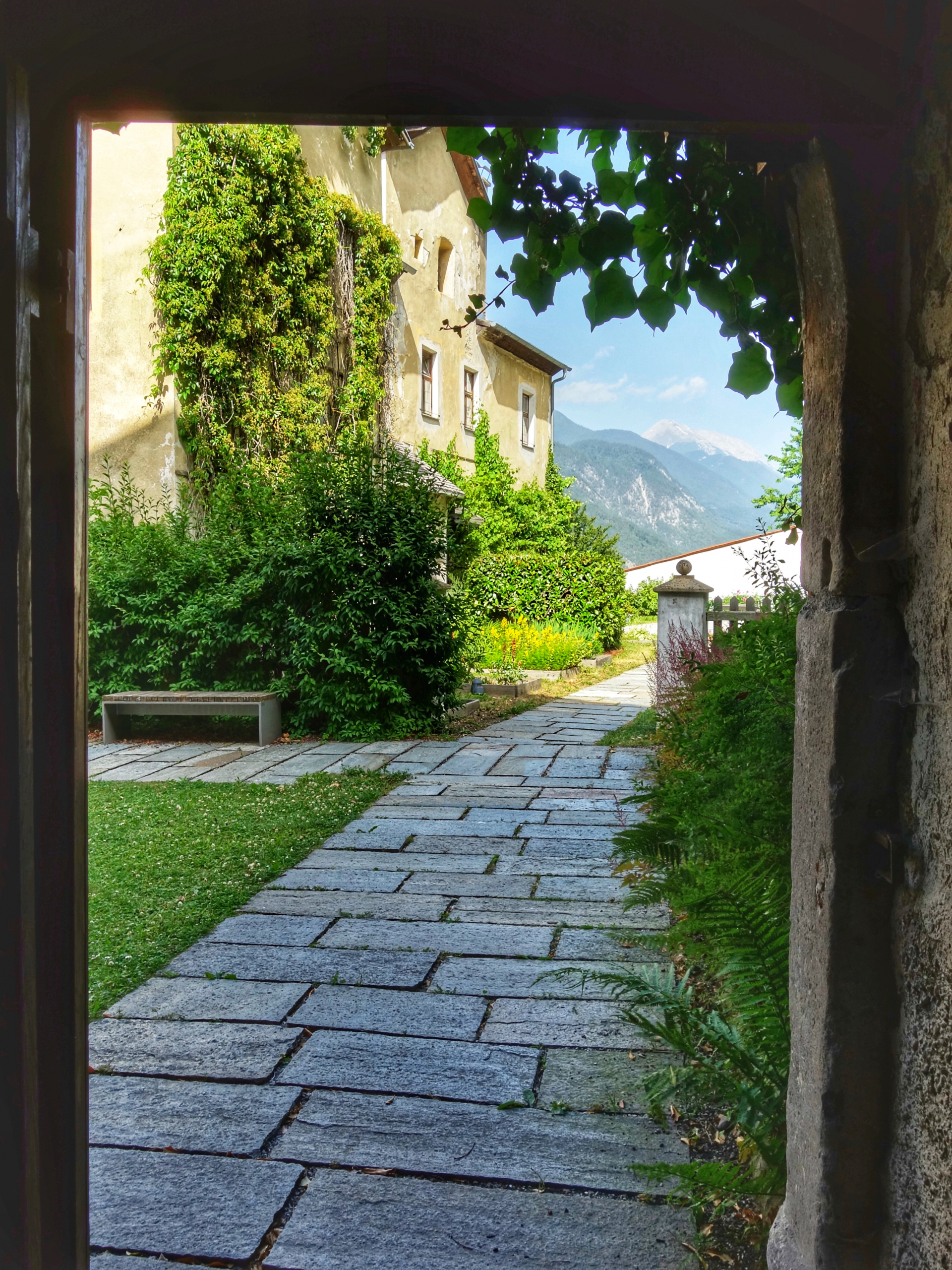 Der Innenhof des Ris-Schlössl wirkt auf Besucher märchenhaft. Scheinbar der Zeit entrückt mit Blumen- und Gewürzbeeten und einem barocken Stufengarten. Jakobspilger, die auf ihrem Weg in Richtung Santiago de Compostela hier Rast machen, schätzen den Brunnen jedenfalls genauso wie die Ruhe.