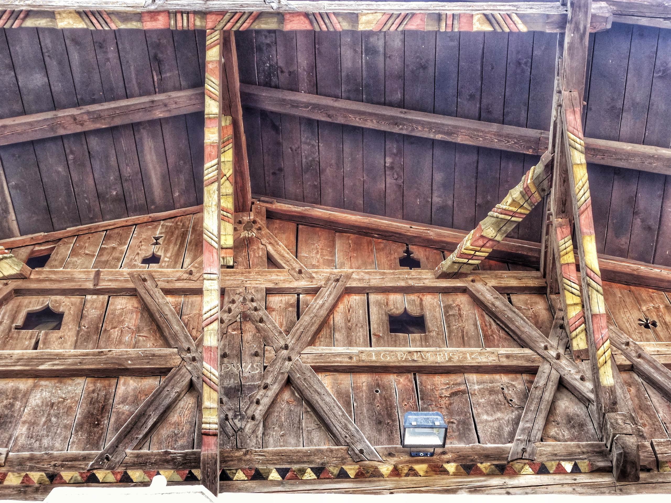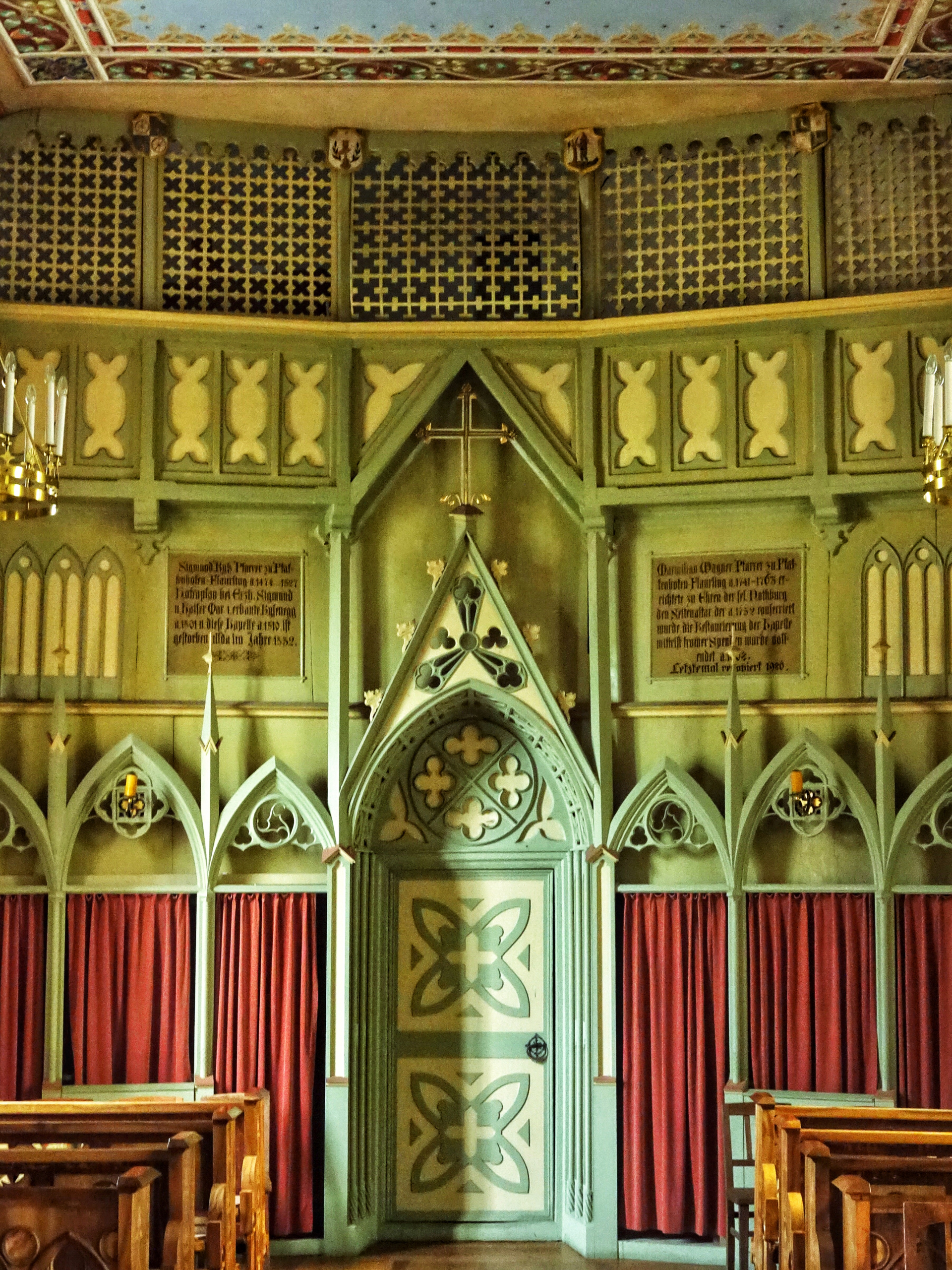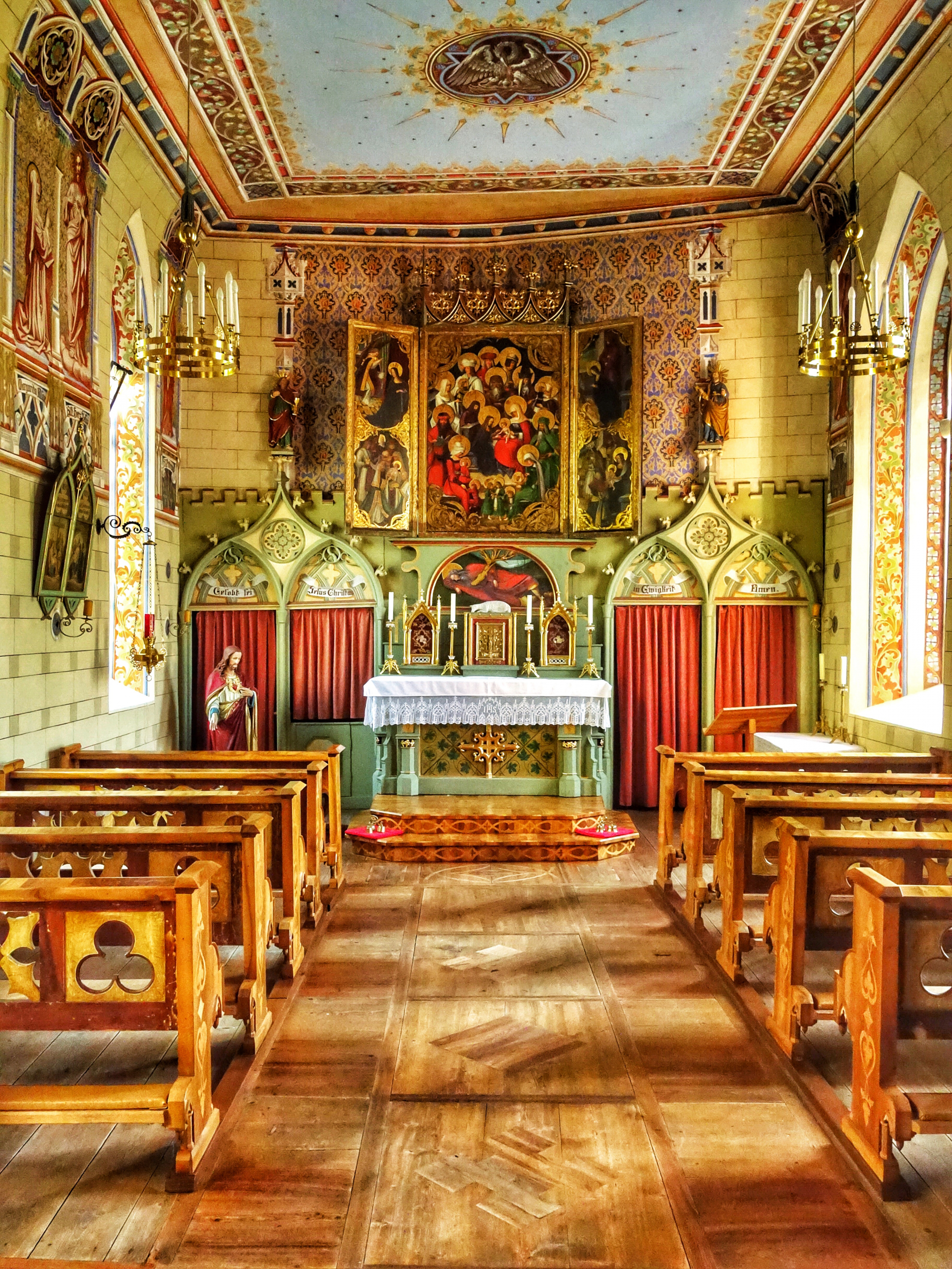 Der gotische Ris-Altar in Flaurling, umgeben von Wandmalereien im Nazarener-Stil des 19. Jahrhunderts.