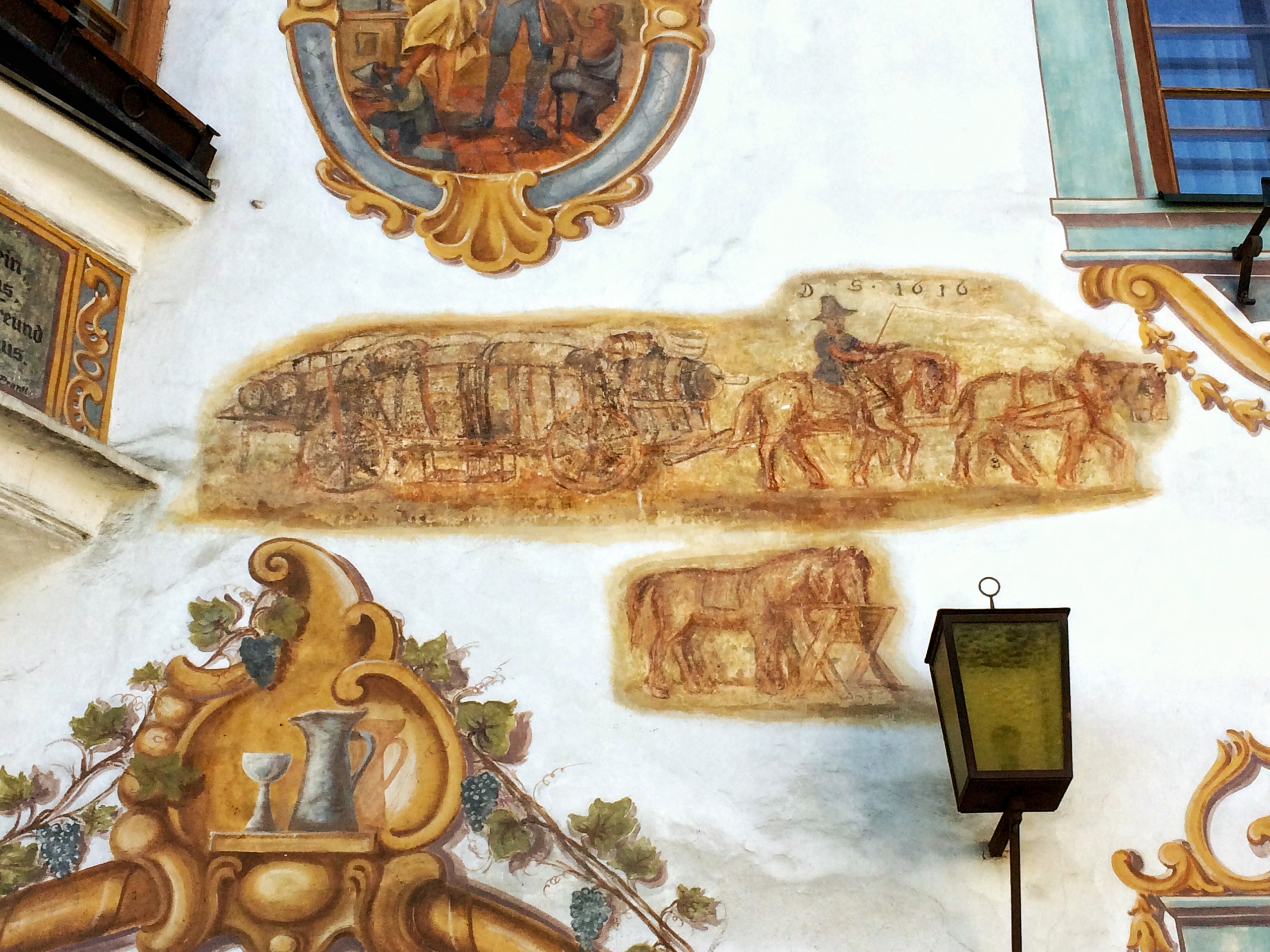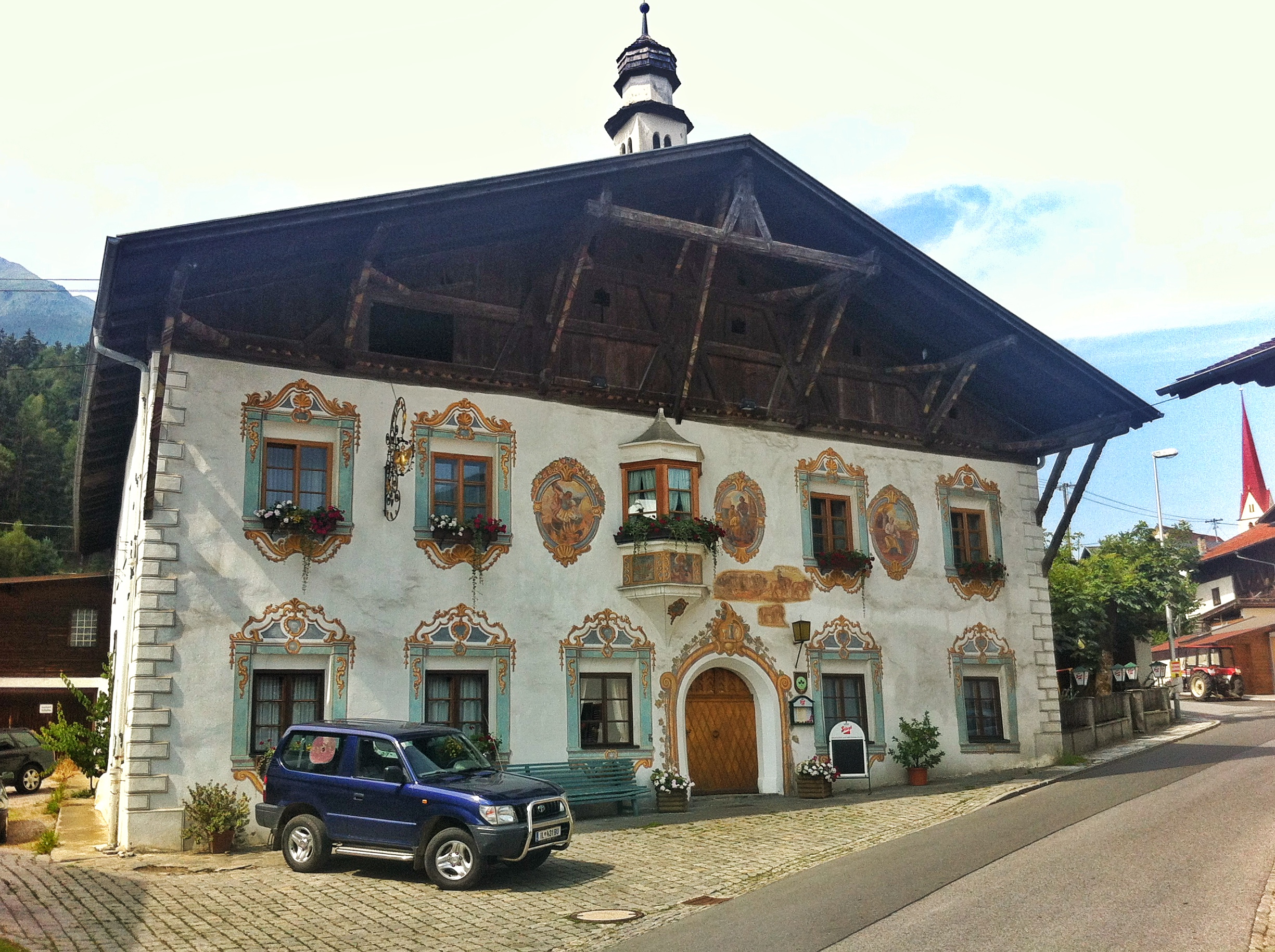 Als ich vor einigen Jahren den Tiroler Jakobsweg als Pilger erforschte war ich von der Silhouette des Ortes überrascht. Es ist nicht nur das Schlösschen, das wie auf einem Thron sitzend Flaurling überragt. Ich stand urplötzlich vor einem Gebäude, das einst eine wichtige Rolle gespielt haben musste: das Gasthaus zum „Goldenen Adler“ in Flaurling. Denn die Außenfresken berichten von einer Zeit, in denen das Dörfchen reich war. Farbenprächtig aber mysteriös bleiben für mich allerdings die bemalten Balken, die das Dach auf der Stirnseite stützen. Jedenfalls ein Haus, das zu den historischen Gasthäusern unseres Landes zu zählen ist.