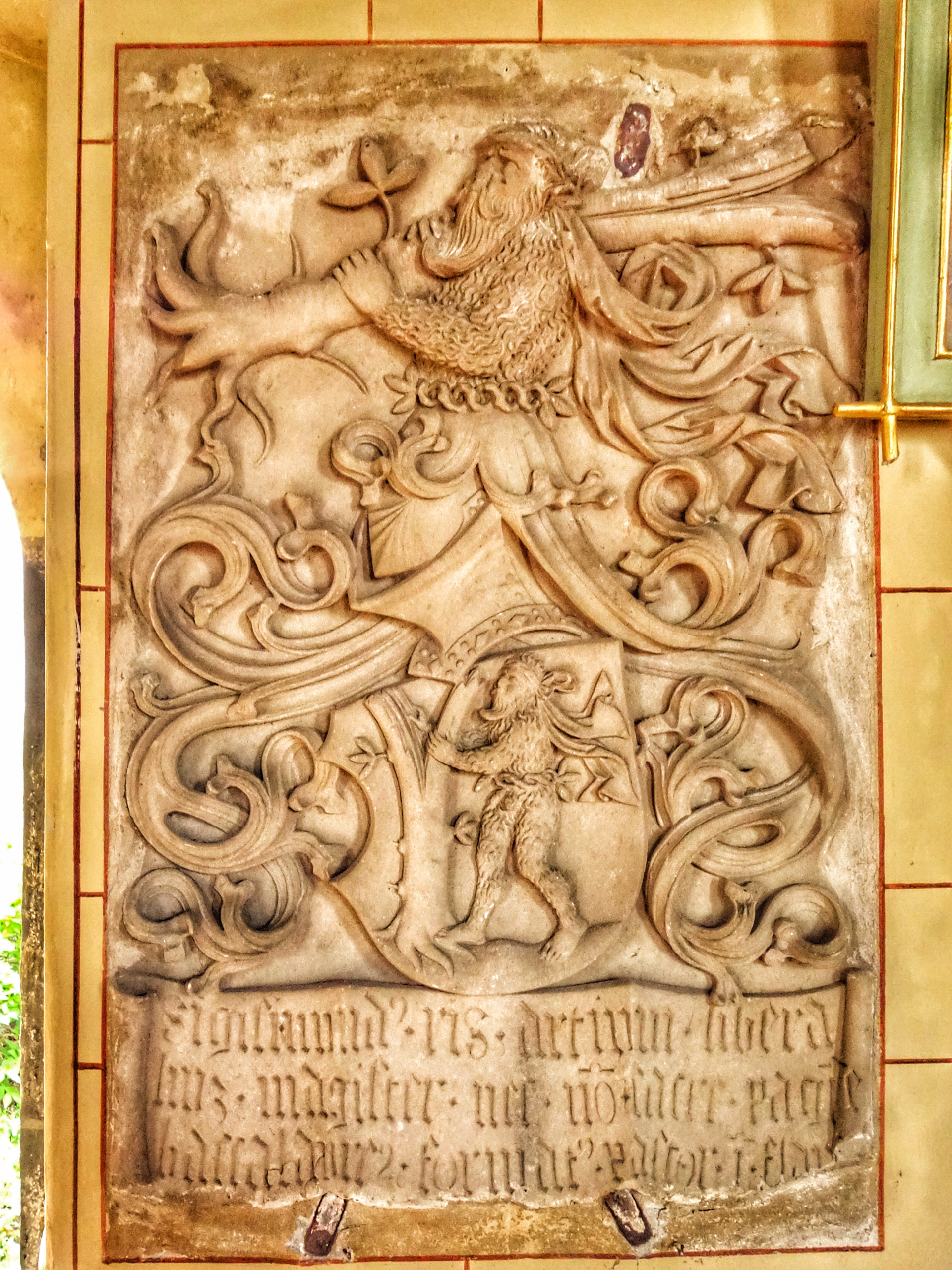 - Der Wappenstein ‚mit Helmzier‘ von Sigmund Ris, 1510 verliehen von Kaiser Maximilian in der Kapelle des Schlössls.