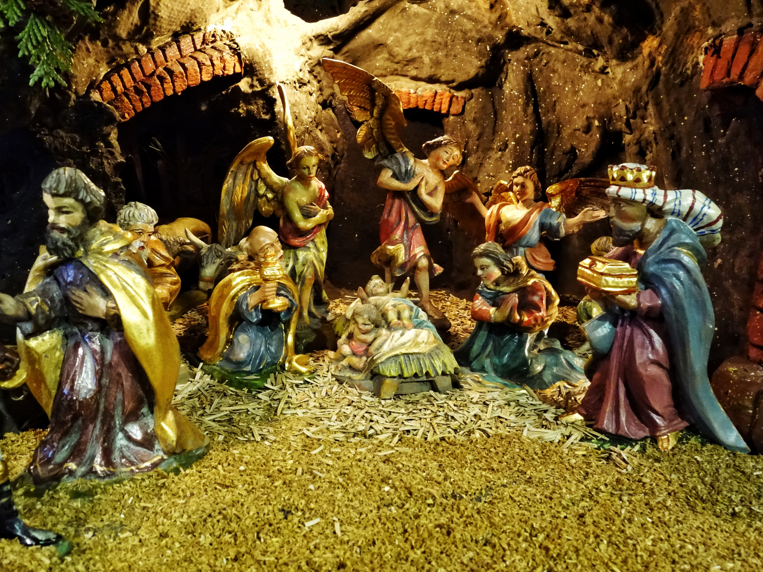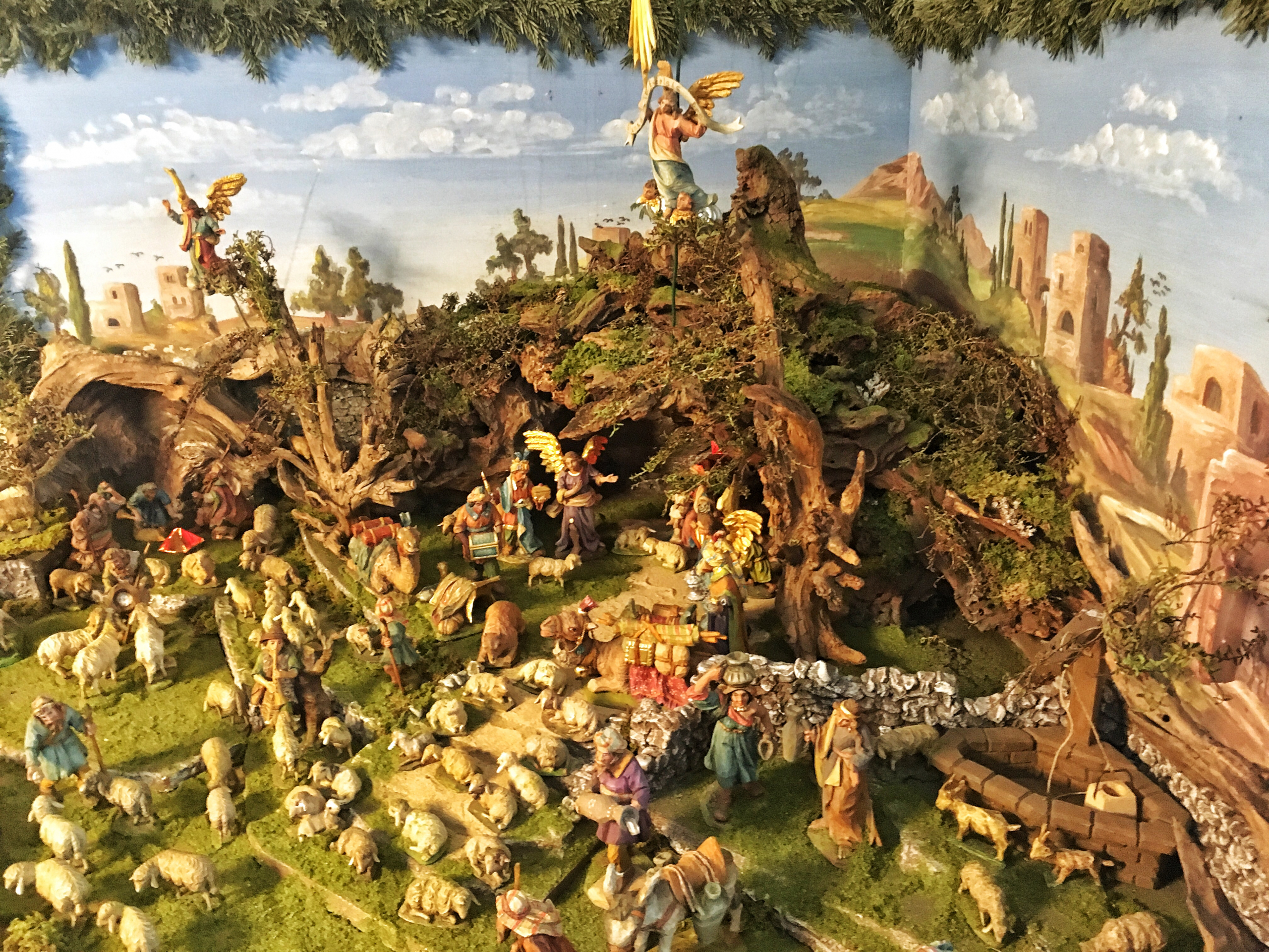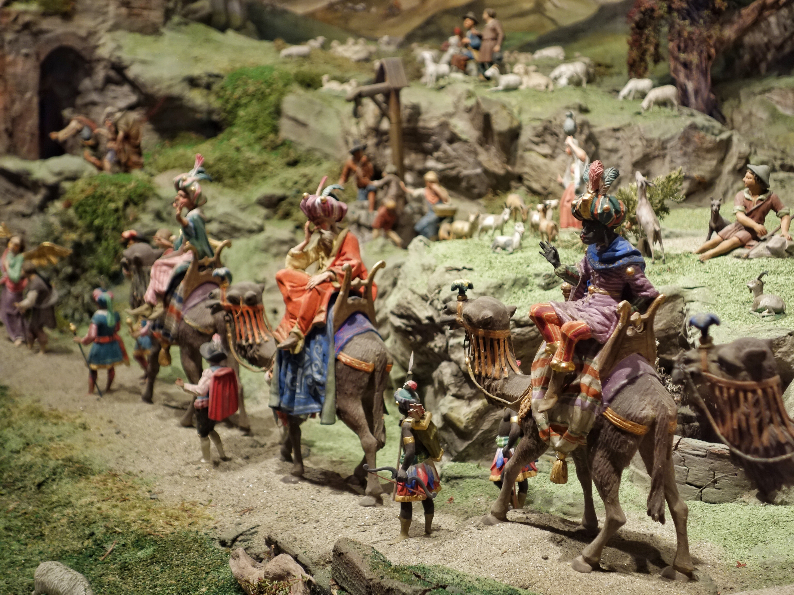Die Zettel weisen Besuchern erst einmal den Weg durch verwinkelte Stiegen und Gänge. Bis man urplötzlich vor einem wahren Gesamtkunstwerk steht, für das es einen eigenen Raum braucht. Denn die Ausmaße dieser Krippe von 5,2 Metern Breite auf 2,4 Meter Tiefe sind enorm. Hunderte von Figuren der Krippe – sie wird von Glasscheiben geschützt – sind jeweils zu biblischen Szenen geordnet, die in dieser Krippe dargestellt werden. Von der Verkündigung über die Herbergssuche, der Geburt im Stall, den Hirten auf dem Feld bis zum Besuch der Heiligen Drei Könige wird die Bibel in Figurengruppen dargestellt und zitiert. Die Hintergrundbemalung sorgt für eine echt orientalische Stimmung. Weshalb aber die Scheiben? „Es wurde schon versucht, seltene Figuren zu stehlen“, sagt Dr. Josef Weber, der uns die Krippe erklärt.