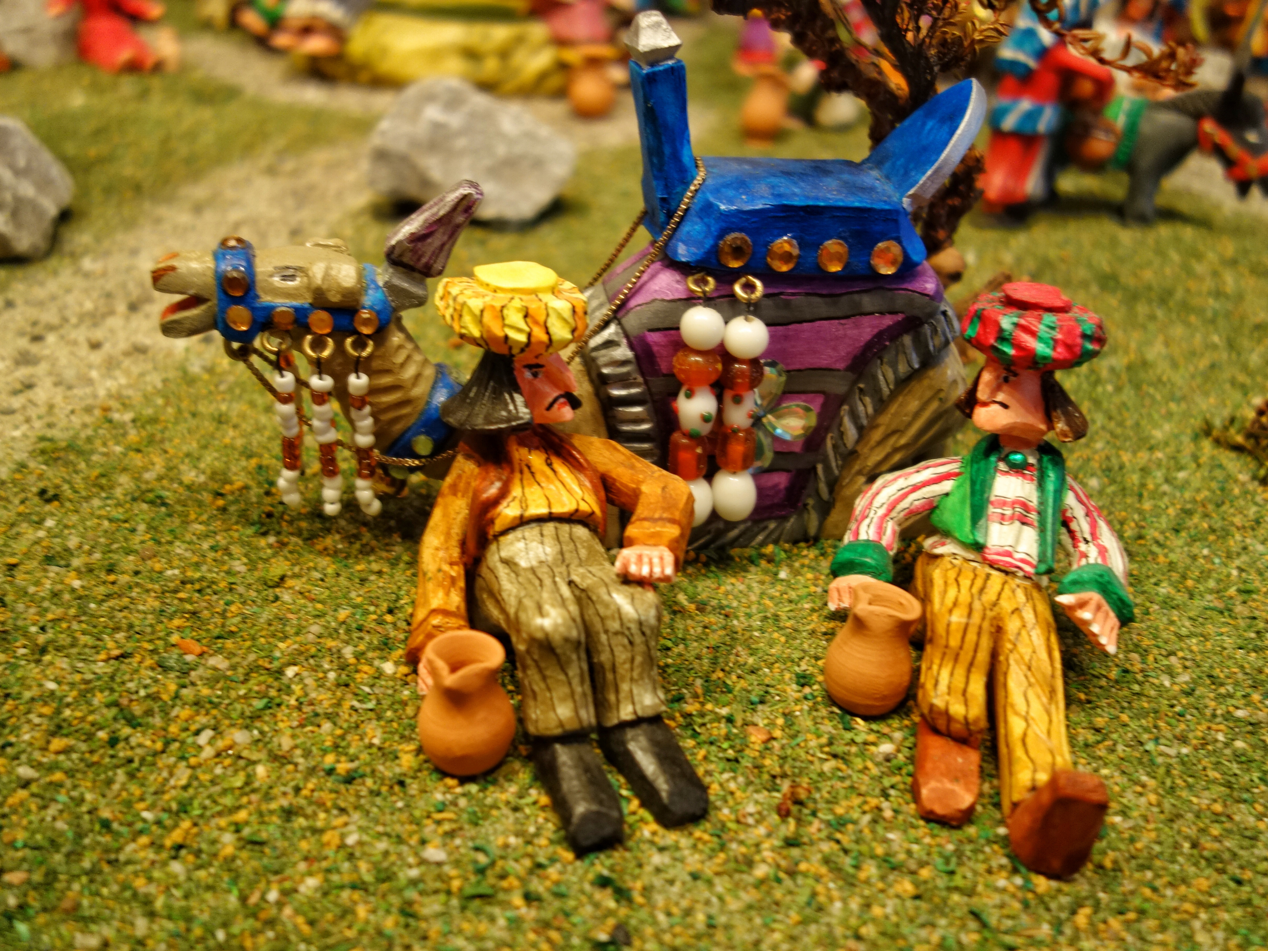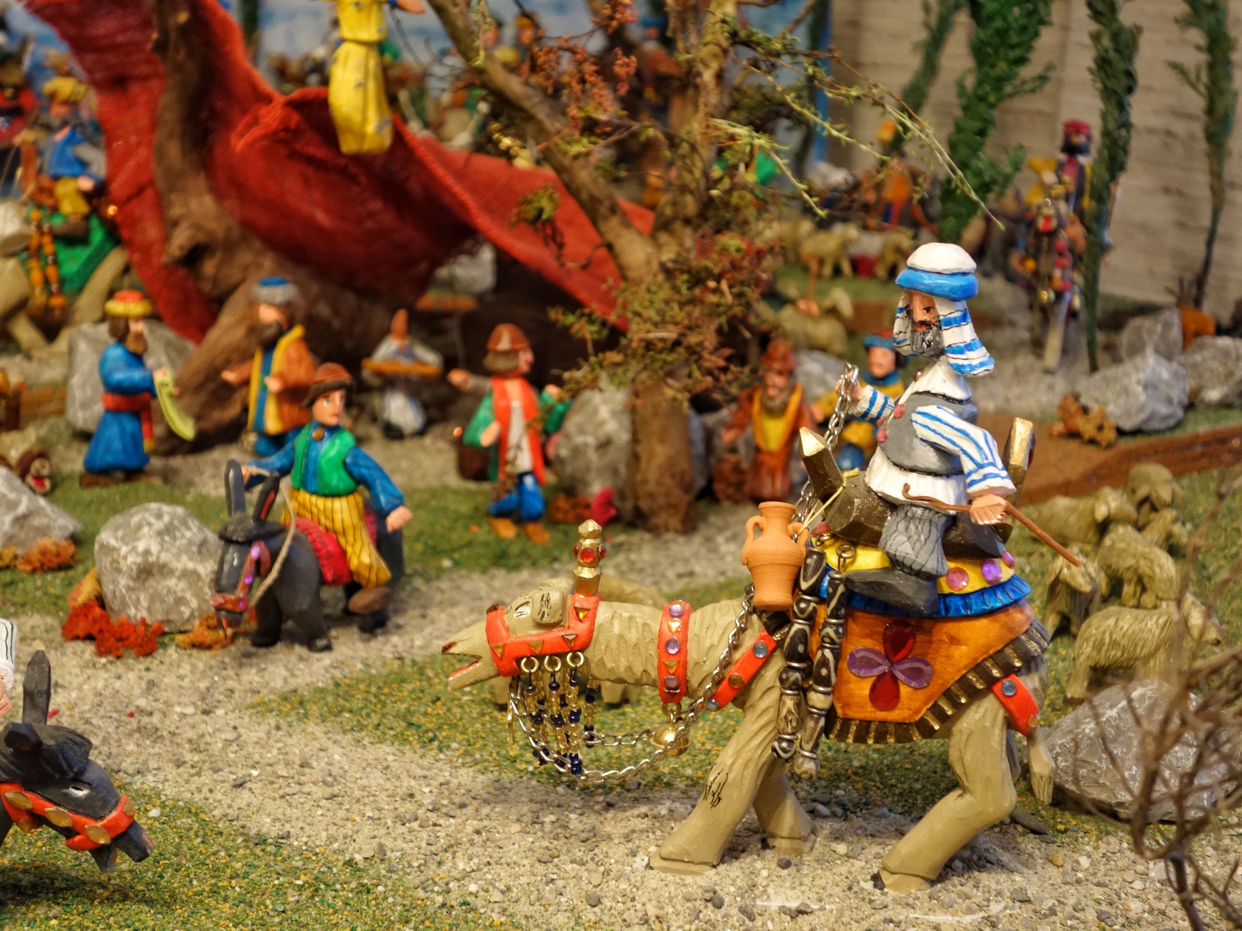 Nach einem Begrüßungskaffee besichtige ich seine Hauskrippe. Nun erahne ich, dass es auch bei Krippenfreunden so etwas ähnliches wie ‚Copyright‘ gibt. Konrad will nämlich nicht, dass ich die Figuren in seiner Krippe aus der Nähe fotografiere. Vor allem die Drei Könige auf ihren Kamelen hätten es mir angetan, eine wunderbare Figurengruppe, farbenprächtig und einzigartig. „Das wäre Wasser auf die Mühlen all jener, die solche Figuren dann einfach vom Foto weg nachschnitzen“, sagt er. Kein Problem, ich verstehe das.