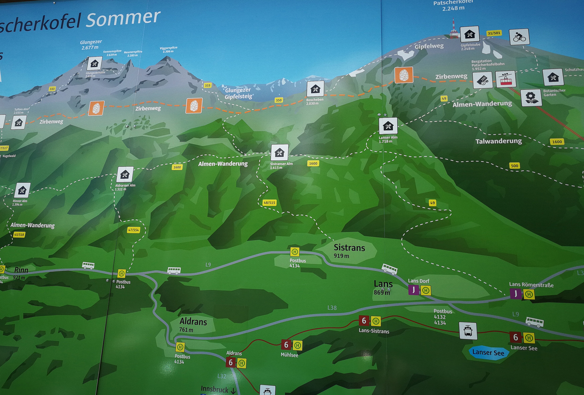 Diese Etappe führt dich von der Bergstation Patscherkofelbahn über den Zirbenweg und Boscheben, Meissnerhaus, Patscher Alm, Igler Almboden, Lanser Alm, Sistranser Alm, Aldranser Alm und Rinner Alm nach Rinn.