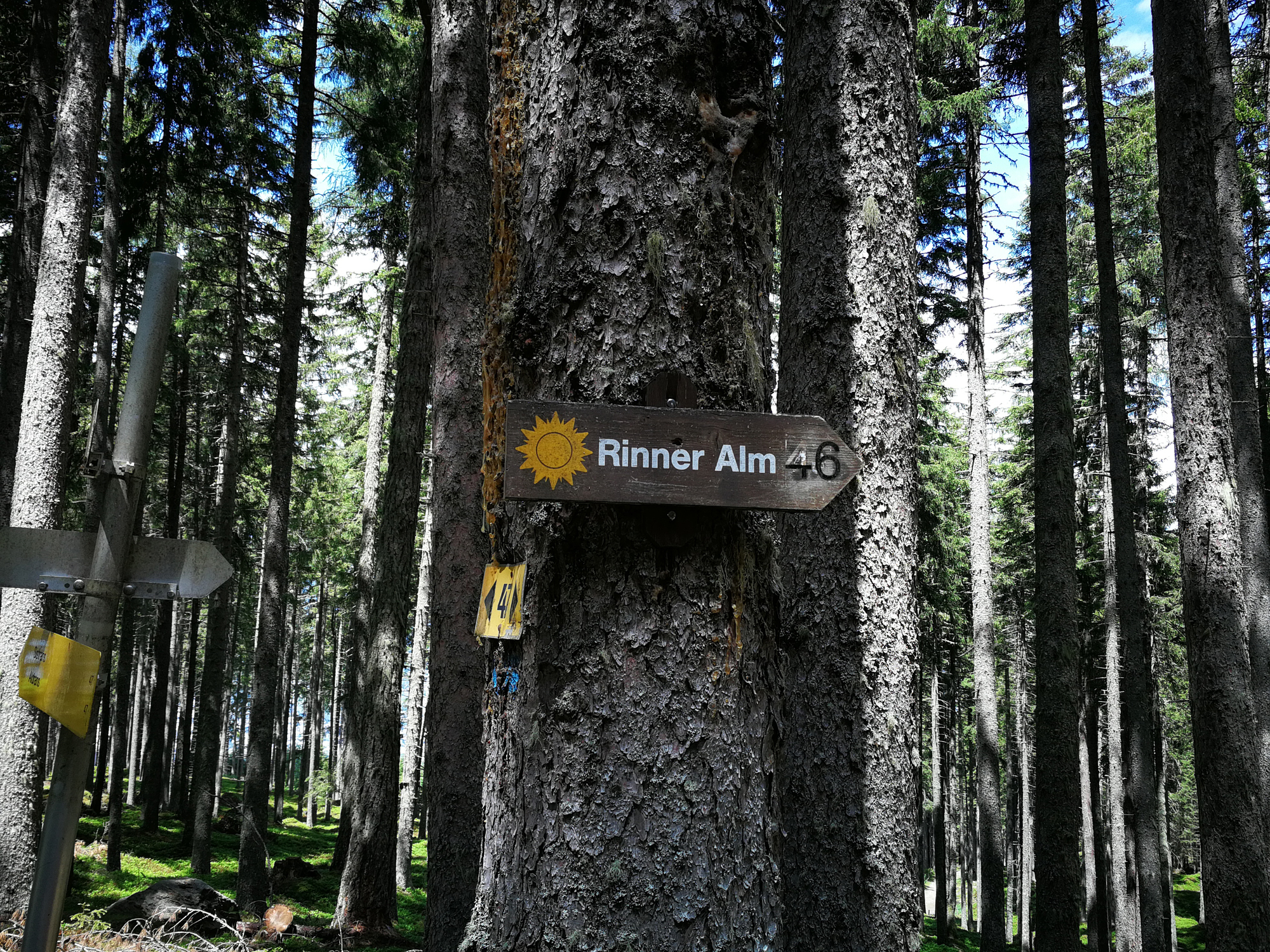 Nach dem Mittagessen etwas müde und träge, passt es gut, dass es jetzt auf dem Forstweg abwärts und über einen wunderschönen Waldsteig eben in Richtung Rinner Alm geht. Die Rinner Alm liegt auf 1.492 Meter und damit ist die vierte Alm und vierte Einkehrmöglichkeit erreicht. Auch hier würde man sich gerne durch das eine oder andere Gericht der Speisekarte kosten. Kaffee und Kuchen tun`s auch. Schließlich kommt jetzt die letzte Herausforderung der Tour. Es geht auf der Forststraße abwärts nach Rinn. Und von dort mit dem Bus zurück nach Innsbruck.