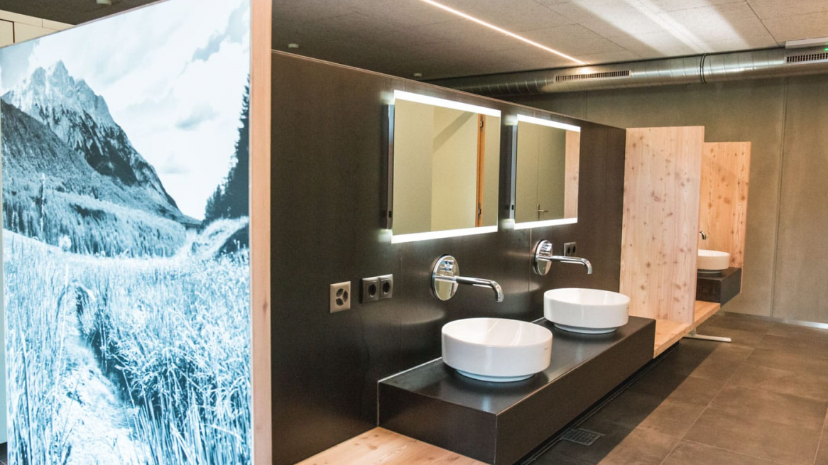 Außerdem ist eine Wärmerückgewinnung in allen Geräten verbaut, wie zum Beispiel in den Lüftungen und beim Duschwasser. Dieses innovative Verfahren ist generell in Tirol noch rar und sicherlich zukunftsweisend. Mit den Solarpaneelen am Dach will man 20% bis 25% des Energiebedarfs decken. Die Energiedaten sollen später über die Website einsehbar sein, Transparenz wird groß geschrieben. Übrigens ist das auch der Grund, warum man in den Sanitäranlagen die Abzugsrohe nicht verbaut hat – hier soll sichtbar sein, was notwendig ist.