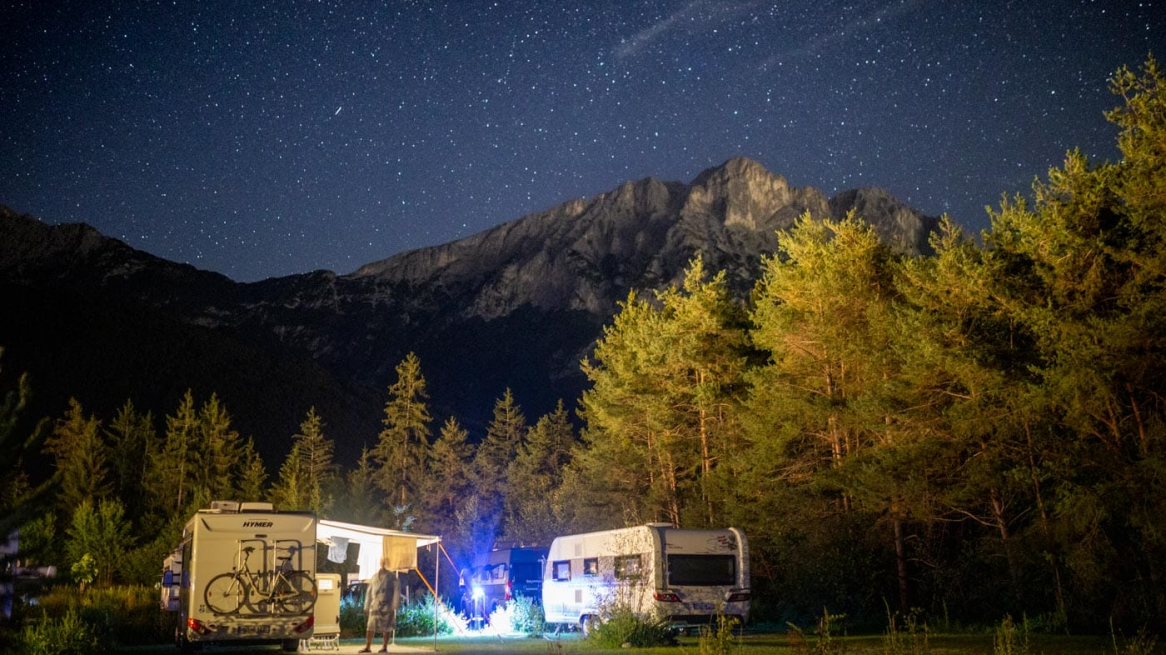 Schließlich ist das letzte Tageslicht verschwunden und immer mehr Sterne funkeln von oben herab. Sogar ein paar Sternschnuppen können wir sehen! Einige Camper sitzen noch gemütlich vor ihren Wohnwägen beisammen, wir verkriechen uns langsam in unser eigenes Bett. Herrlich, die frische Luft und diese Ruhe!
