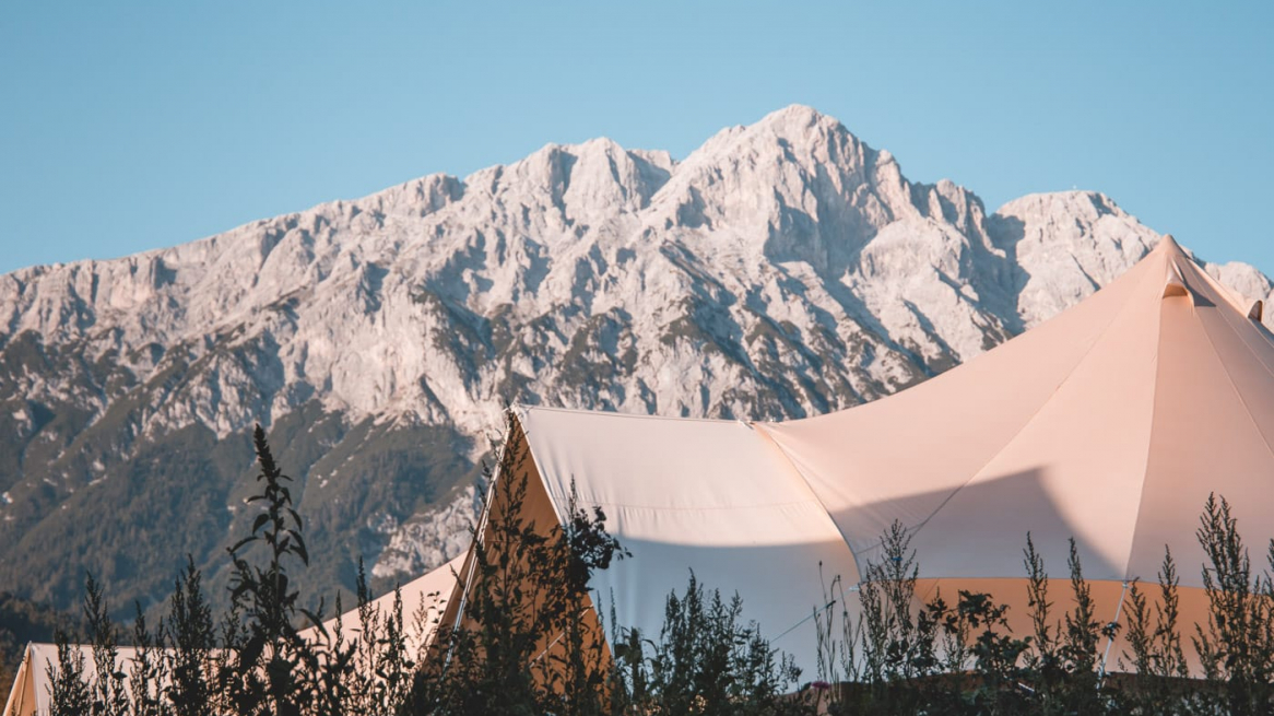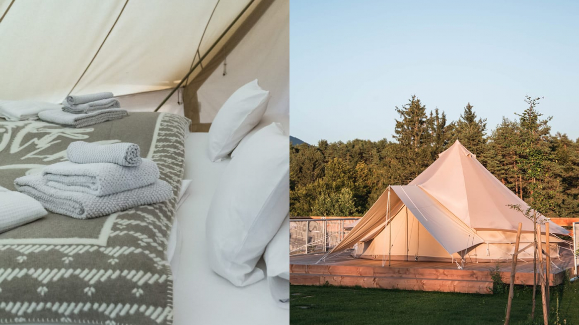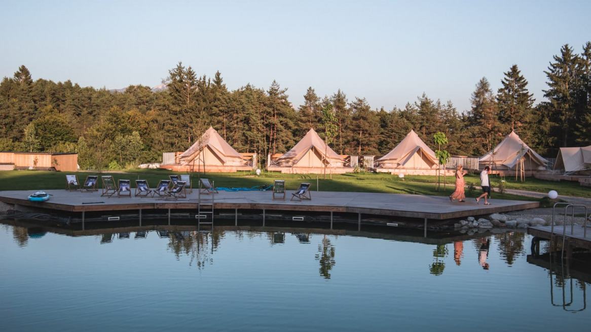 Direkt neben dem Badeteich stehen einige Zelte für Glamping-Gäste bereit. Wer also lieber auf einem “echten” Bett schlafen möchte, als auf einer Matratze am Boden, der liegt hier richtig. Die modernen Verschlüsse ermöglichen sogar ein Versperren des Raumes mit einer Zimmerkarte, wie man sie von Hotels kennt.
