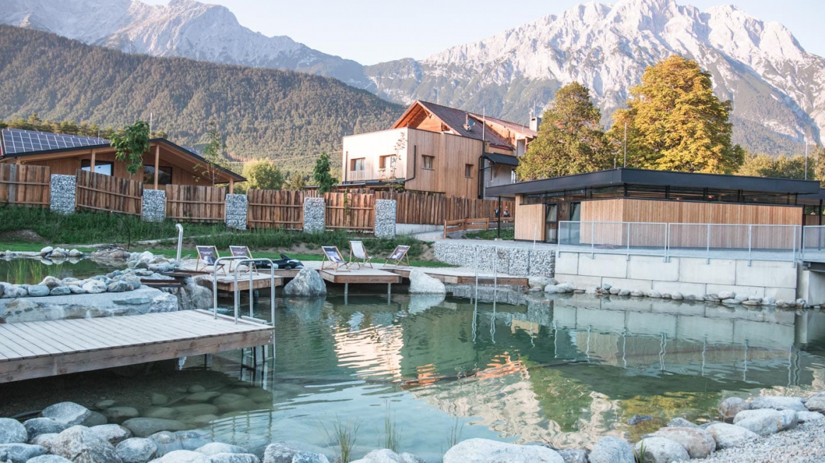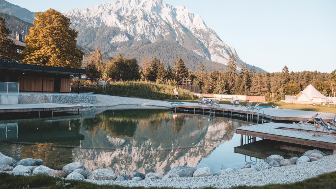 Beim Rundgang über den Platz gerate ich nur so ins Staunen: Es gibt sogar einen Naturbadeteich, in dem sich einige Gäste gerade abkühlen. Obwohl es bereits September ist, sind die Tage noch warm. Wer lieber nur die Zehenspitzen reinhält und die Aussicht auf die Mieminger Kette genießt, kann das von den Holzplattformen aus tun.