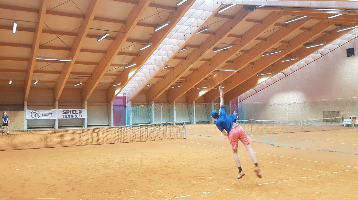 Auch Indoor ist die Infrastruktur der Turnerschaft Innsbruck sehenswert. So serviert der amtierende Vereinsmeister von TI Tennis, Florian Kury. © spieltennis.com