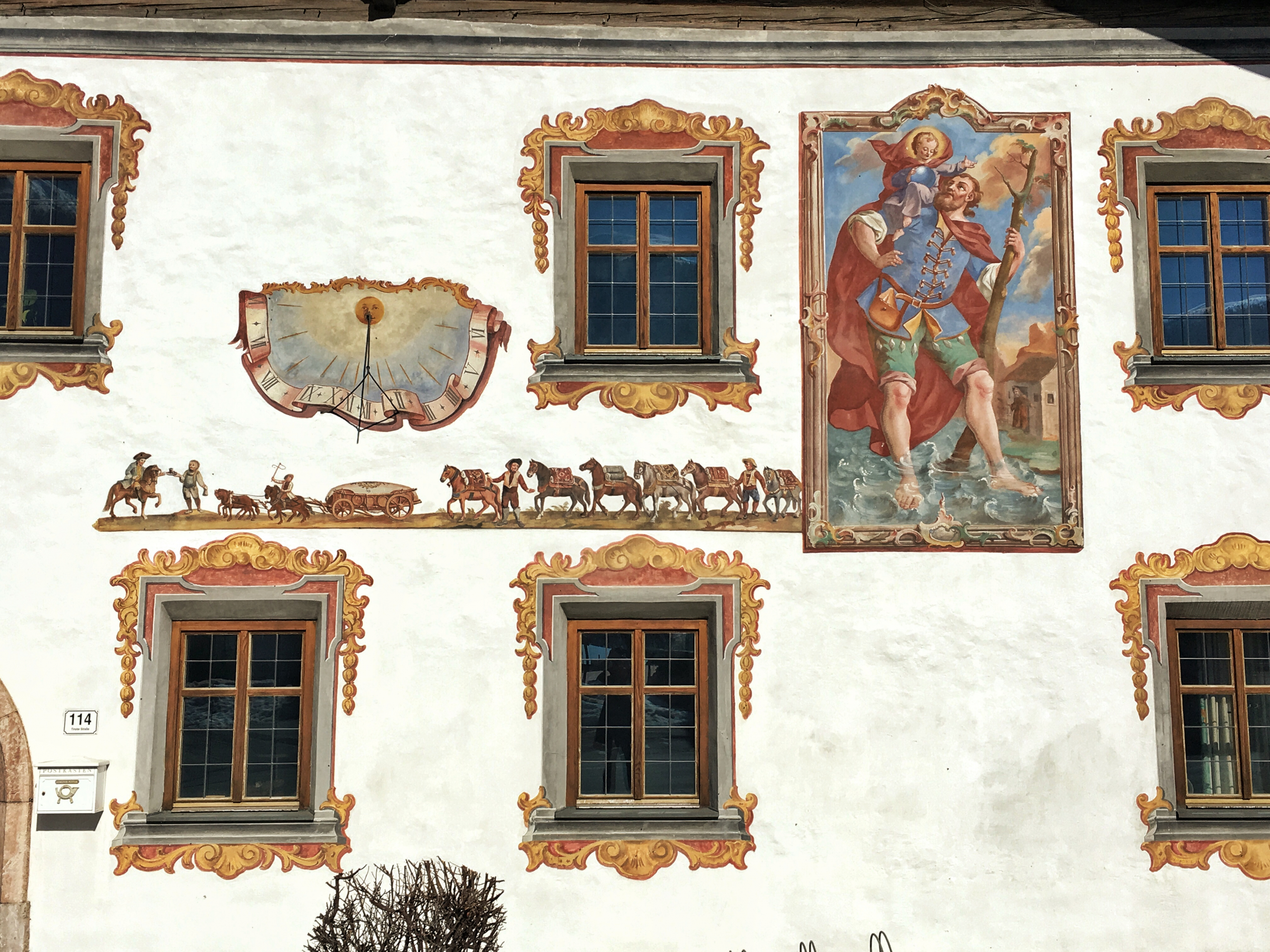 Das einstige Gasthaus Baldauf und die sich auftürmenden Berge der Mieminger Kette. Im Bild das zweite große Fresko: ein Heiliger Florian.