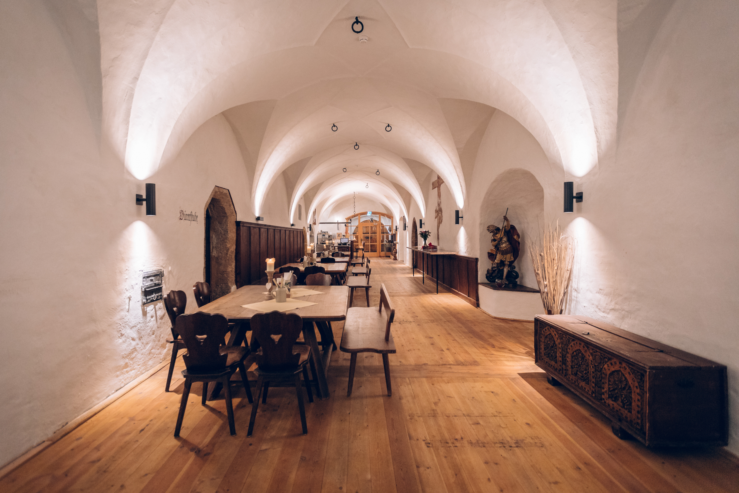Ähnlich der Mellaunerhof, der etwa zwei Kilometer weiter westwärts liegt und zu Fuß oder mittels öffentlichem Bus erreichbar ist. Der ‚Öttlhof‘, wie er früher genannt worden ist, wird urkundlich erstmals 1472 erwähnt. Die heutige Fassade stammt allerdings aus dem 18. Jahrhundert, die Fassadenmalereien wurden 1950 angebracht. Im vergangenen Oktober wurde diesem wunderschönen Haus nach einer mustergültigen Renovierung durch die deutsche Messerschmitt-Stiftung neues Leben eingehaucht. Das historische Gasthaus ist wieder voll im Betrieb und bietet neben einer exzellente Küche auch wunderbar-geschmackvoll restaurierte Zimmer zum Verbleib an.