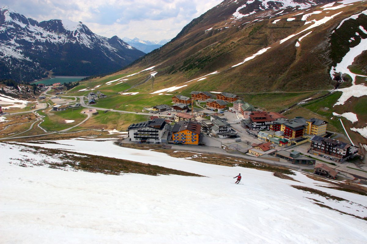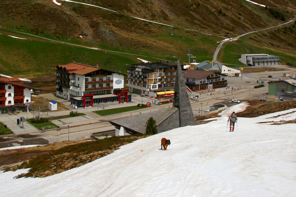Kühtai Ende April 2018. Fast geschlossene Schneedecke bis zum Hotel auch auf den südseitigen Hängen.