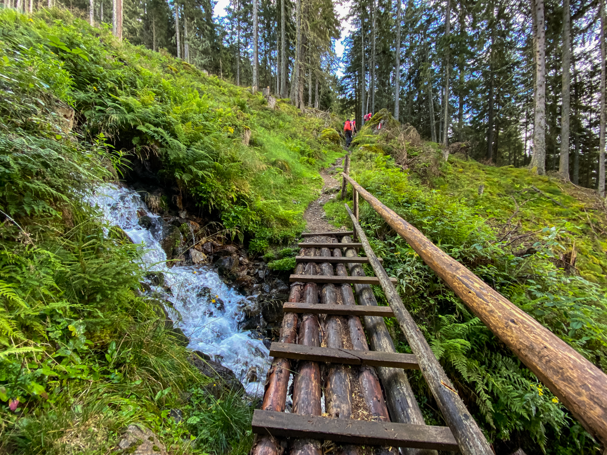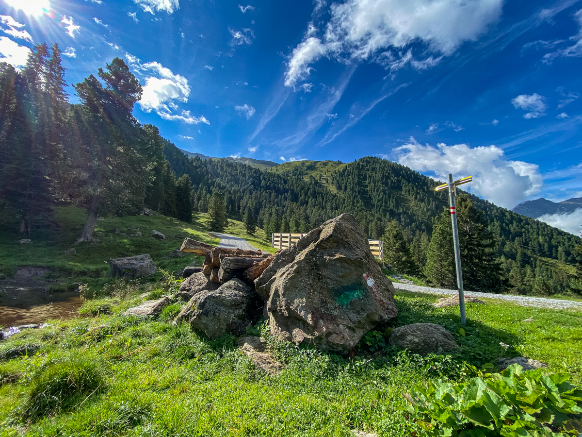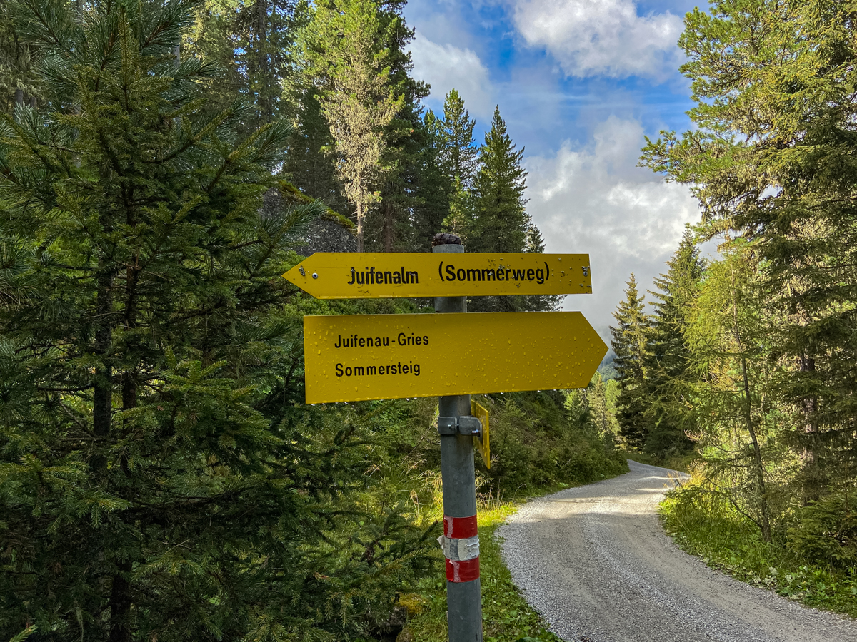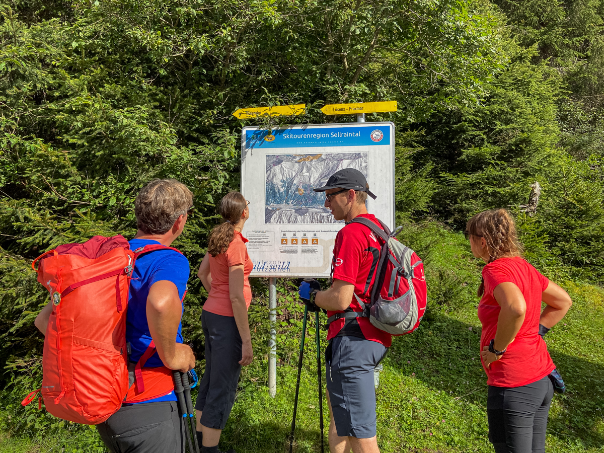 Von der Tourismus Information Gries geht es dann aber erstmal noch ein Stück mit dem Auto ins kleinere Lüsental zum Startpunkt (Seehöhe 1.430 Meter) am Wanderparkplatz zur Juifenalm. Weil uns auf der Tour nur noch zwei deutsche Nordmenschen begleiten, kommt unsere fünfköpfige Fahrgemeinschaft im Kleinbus der beiden Wanderführer unter. Vor dem großen Infoboard mit Wanderkarte kommt dann sogar ganz kurz echtes Expeditionsfeeling auf, denn es werden Wanderstöcke gezückt, Stiefel streng geschnürt, Stirnbänder zurechtgerückt, alles dick mit Sonnenschutz einmassiert und sämtliche Tracking-Apps auf Sportuhren und Smartphones gestartet. Dann geht es sofort ziemlich steil und schön bergauf, denn wo Forstweg und Winterrodelbahn in gemütlichen Serpentinen aufsteigen, nimmt der malerische Sommersteig den direkten Weg durchs Dickicht.