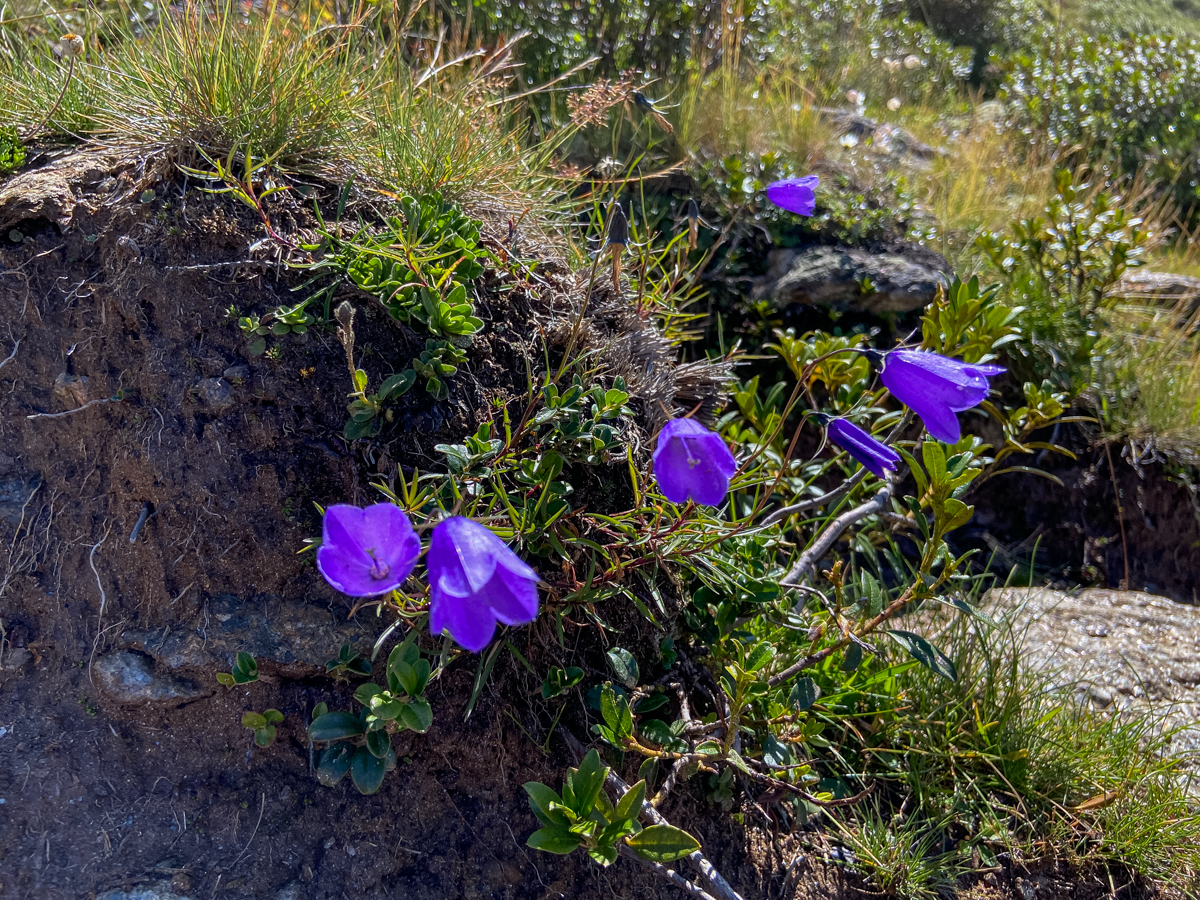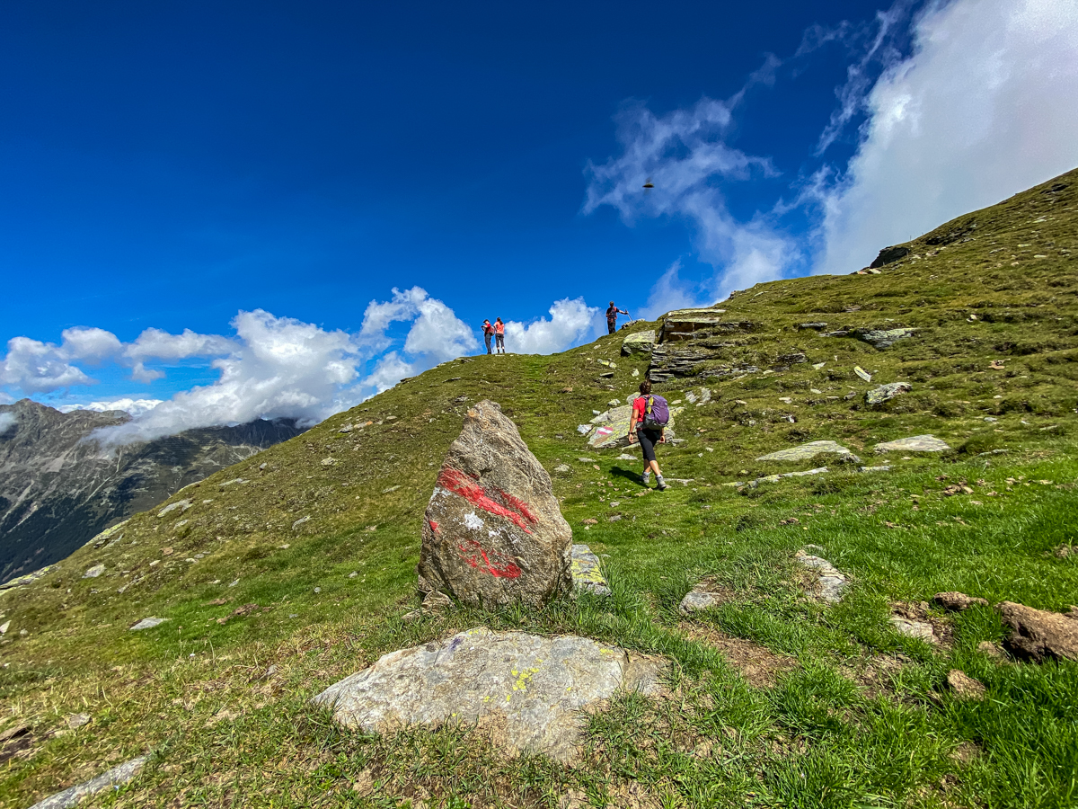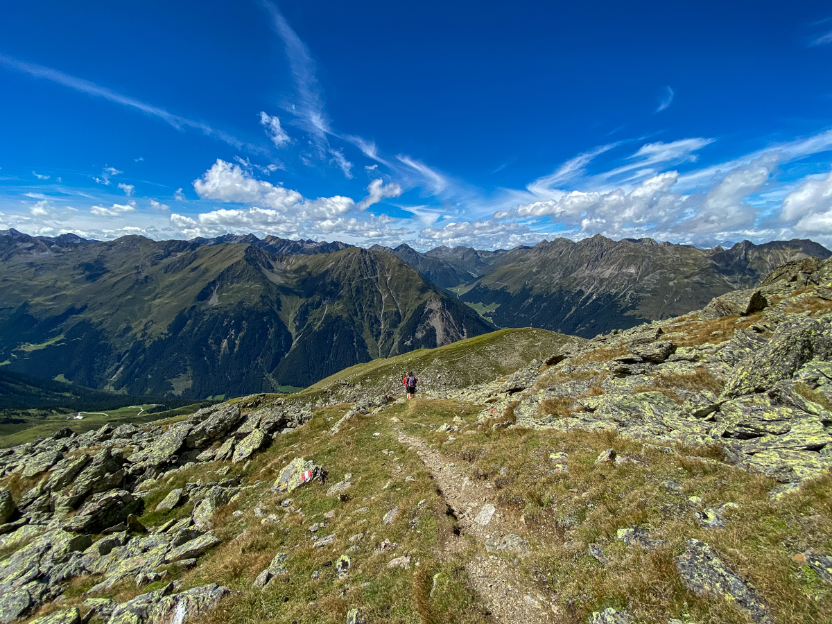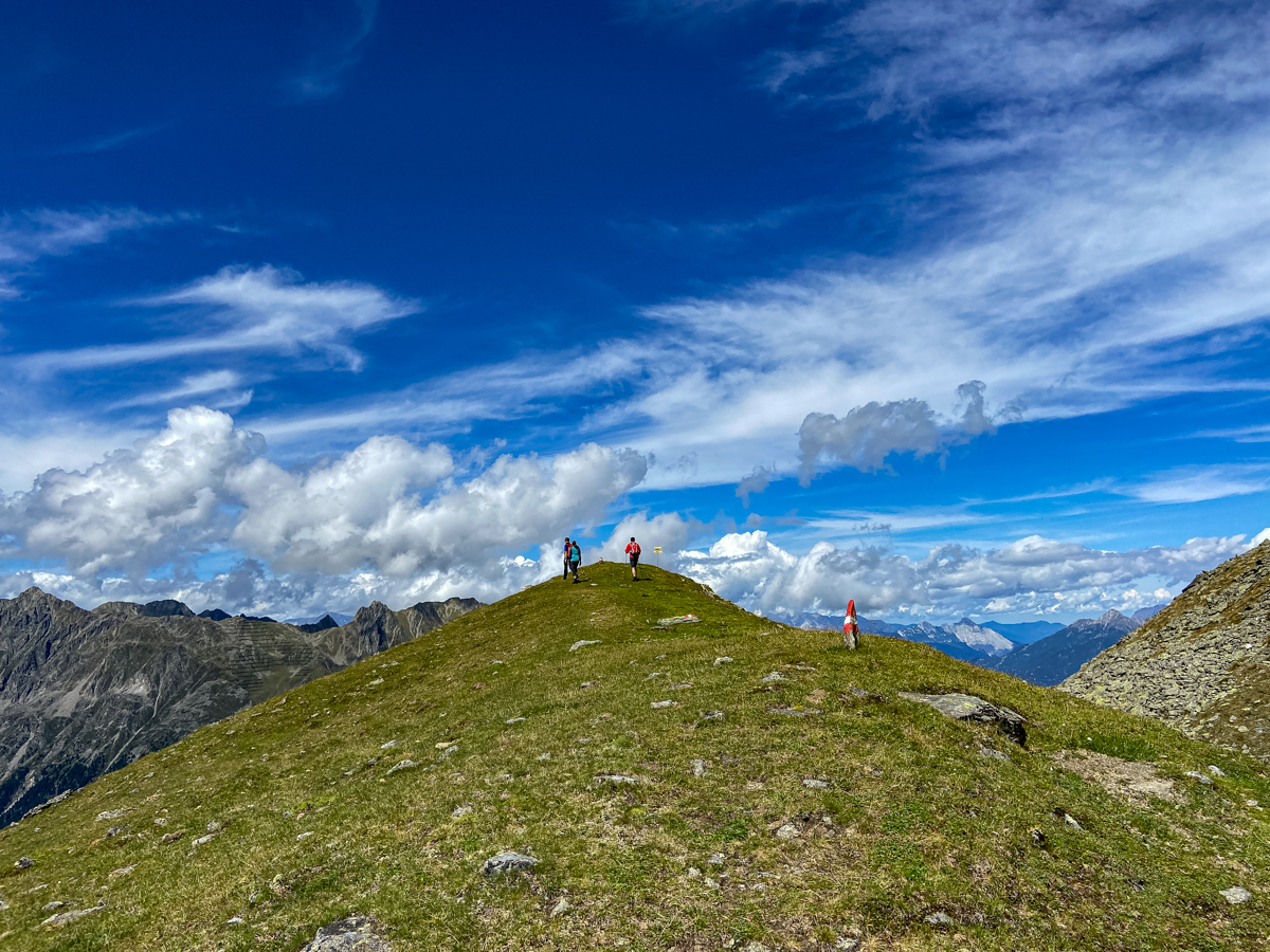 Frisch gestärkt und äußerst motiviert (ich war beim hausgebrannten Zirbenschnaps schwach geworden) starten wir die Gipfeletappe unserer Wanderung. Oberhalb der Baumgrenze wird es spürbar wärmer und der grobe Glimmerschotter (der silbrige Anteil im Schiefergestein) blendet so hell, dass der schmale Wanderweg uns durch die Alpenrosen und Moosbeersträucher (Blaubeerbüsche) silbrig entgegenleuchtet. Überall begegnen uns unterwegs Almkühe, die hier erstaunlich agil durch das alpine Gelände steigen. Wir staunen auch über Pferde, die in weiter Ferne über Hochalmwiesen galoppieren. Nur die vielen Murmeltiere, die uns hier allerorts frech hinterherpfeifen, sind wahre Meister im Verstecken und wollen nicht gesehen werden. Dafür tanzen unzählige Schmetterlinge über die Wiesen, kleine Grashüpfer geben Akrobatikeinlagen und in der Luft kreisen seltene Vögel, die man in den Städten kaum wo kennt. Als wir den Gipfel des Fotscher Windeggs auf stolzen 2.577 Metern erreichen, haben die Wolken einem derart spektakulären Weitblick Platz gemacht, dass wir minutenlang schweigend staunen müssen.