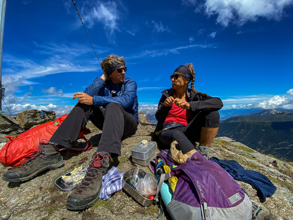Als „Marend“ bezeichnet man in Tirol eine traditionelle Jause. Die besteht üblicherweise aus Variationen von herzhaftem Bauernbrot, g’schmackigem Almkäse, deftigem Trockenfleisch (Speck, Wurzen), hartgekochten Freilandeiern und bunten Gemüsebeilagen nach Lust und Laune. Die beiden Bergwanderführer breiten ein fulminantes Festmahl aus, wir drei Anfänger haben außer ein paar Müsliriegeln natürlich nichts mit. Aber weil eine zünftige Jause am Gipfel einfach am besten schmeckt und wir unterwegs längst Freunde geworden sind, teilen Volker und Christine ihre Köstlichkeiten: Selbstgemachtes Roggensauerteigbrot, Ziegenkäse mit Schnittlauch, Cherrytomaten und Äpfel aus dem eigenen Garten. Selten haben ein paar Bissen Brot so herrlich geschmeckt wie hier oben, frei und wild und wunderbar.