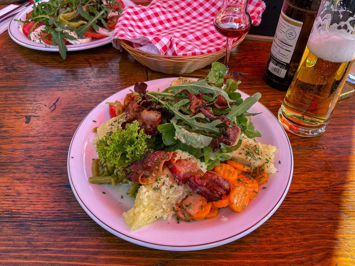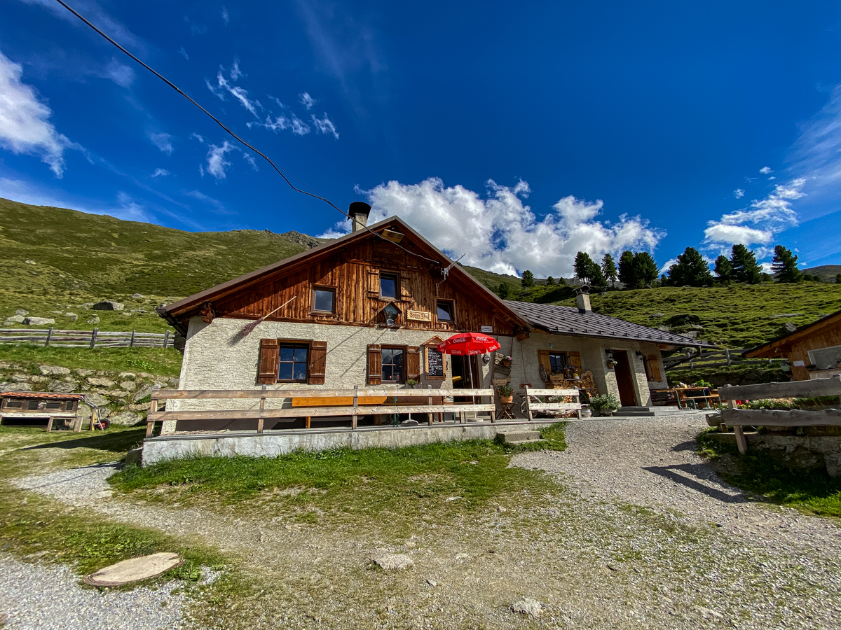 Als wir uns wieder an den Abstieg zur Juifenalm wagen, will niemand zugeben, dass uns der steile Aufstieg doch ein wenig geschafft hat. Als „mittelschwer“ bezeichnet sich die rote Streckenführung der Wanderkarte, da wäre schon noch Luft nach oben also. Somit passt unsere heutige Tour immer noch in die Rubrik „Genusswanderung“, denn – mal ehrlich – wo hinterher kein Muskel brennt, war man eigentlich eh nur spazieren. Und weil die Hütte auch den Abstieg auf halber Höhe belohnt, kommt der Genuss auf dieser Wanderung sogar doppelt des Weges. In unserem Fall mit hausgemachtem Graukas und Alm-Mozzarella, Kaiserschmarren, Kaspressknödeln und Juifen-Zirbenschnaps (diesmal für alle). Danach sind wir heilfroh, dass es den Rest des Weges abwärts geht.