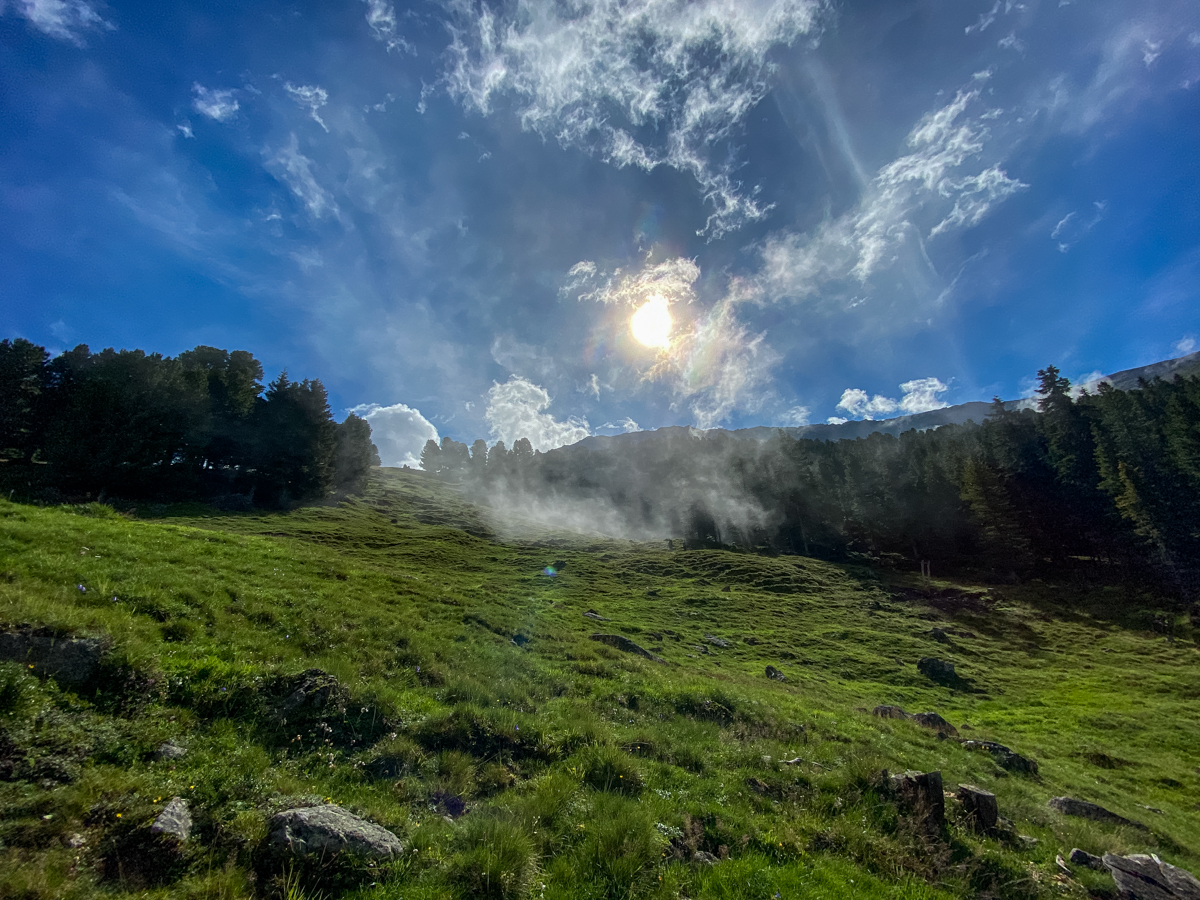 Unterwegs entführen uns die beiden Wanderkundigen in eine Welt abseits der üblichen Wege: verschlungene Pfade durch verwunschene Wälder, entlang eiskalter Gebirgsbäche und über üppige Almwiesen. Überall hängen noch Nebelschwaden, die sich unter den Strahlen der Sommersonne majestätisch über die Berge wälzen und zu imposanten Wolkentürmen stapeln. Die Luft schmeckt frisch, Tautropfen funkeln am Wegrand und über den Zirben kreisen ungewöhnlich viele Fichtenhäher. Sie haben gerade Hochsaison, verraten unsere Bergwanderführer, und verstecken unzählige Zirbensamen zwischen Steinen und Felsspalten. Im Winter werden sie davon nur noch einen Bruchteil unter der dicken Schneedecke wiederfinden – im Frühjahr dann wertvolle Forstarbeit für die Zirbenwälder. Auch über die unzähligen Pilze und Heilkräuter am Wegrand wissen die zwei Wald- und Wiesenprofis viel zu erzählen. Nach einer guten Stunde Aufstieg haben wir auf 2.022 Metern Seehöhe die schmucke Juifenalm erreicht und eine kleine Kaffeepause verdient. Der Gipfelsieg liegt nämlich immer noch vor uns.
