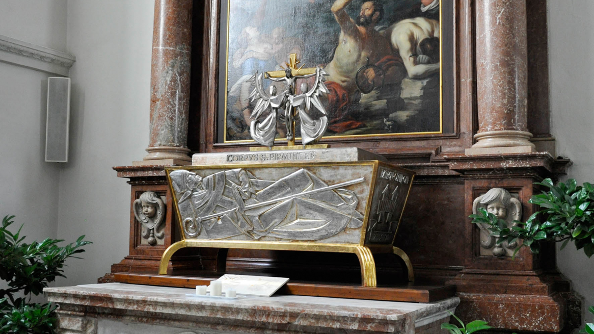Together with St. Notburga, Pirmin is the only saint buried on Tyrolean soil. The bones of the Benedictine are in a shrine on the Pirmin Altar, in the front left side chapel of the Jesuit Church. The partially gilded shrine was designed by the artist Rudolf Millonig in 1954 and has a silver-plated relief of Pirmin and inscriptions. The altarpiece above shows Pirmin, the patron saint of plague patients, with mitre and crozier, sitting on a cloud. Below, plague sufferers with snakes in their hands as a symbol of the terrible disease, which carried off people by the thousands in the Middle Ages and early modern times.