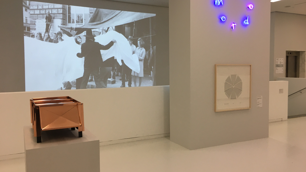 A glimpse of the exhibition "werden. From Michelangelo to ->" at the Ferdinandeum in Innsbruck. In the background a shot of the performance PINK LANE by James Lee Byars and Joseph Beuys. Photo © Laura Manfredi
