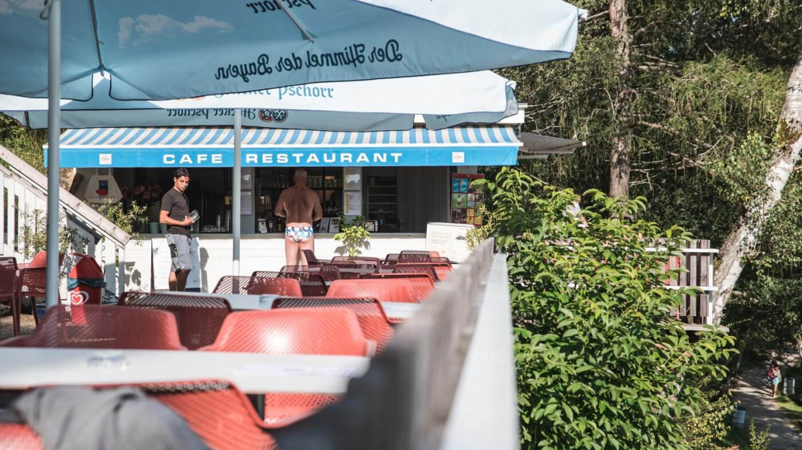 The main building dates back to 1963 and has been repeatedly adapted to the current needs of the time. The upper floor is now used as a function room for conferences, weddings and events. The glass walls provide a view of the lake, sofas and artwork create a great atmosphere. In the basement, next to the sanitary facilities, is the restaurant and the associated terrace with the best view.