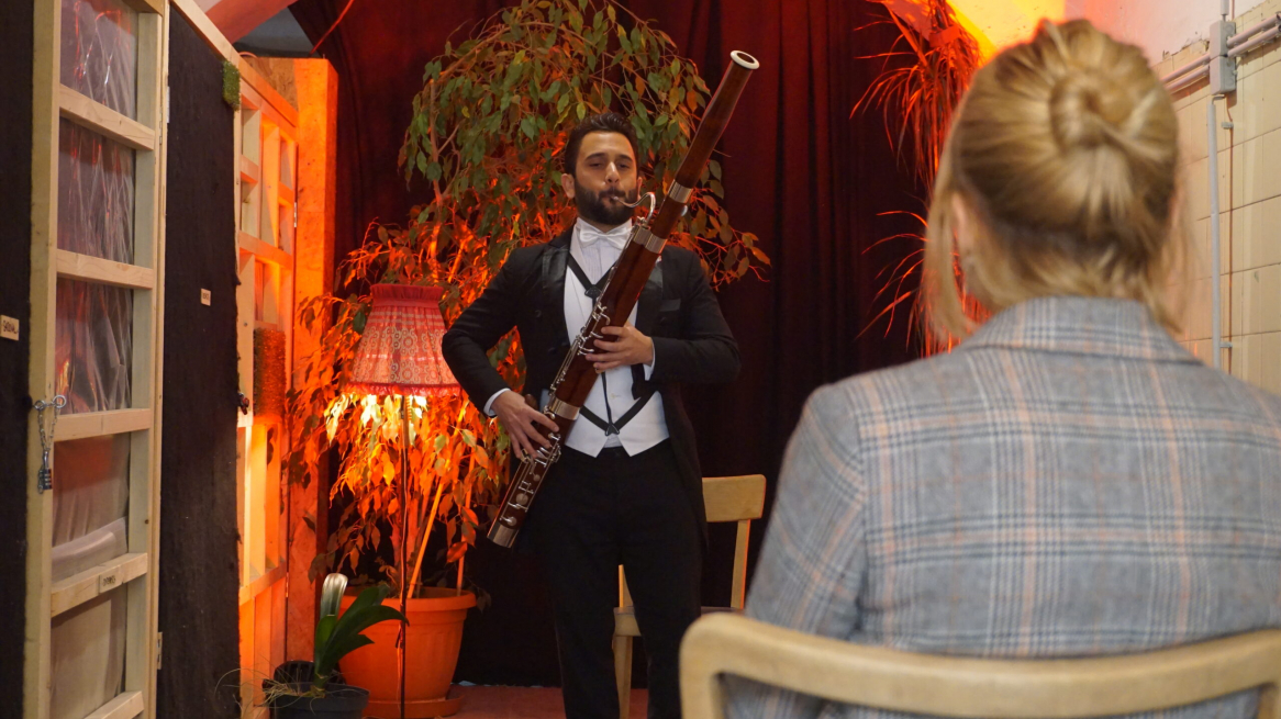 You will be welcomed by an usher, who will explain how this performance-concert works. You will be taken to a room, where you will be alone with the musician. The musician is already there waiting for you. Once you have taken a seat on a chair, three meters away from the artist, you will look each other in the eyes, for quite a long time. I can't say how long it was, maybe a minute. I can only say that it's not something we are used to: looking into the eyes of a stranger for more than a few seconds (with a mask, too) creates a strong intimacy, despite the three meters distance. It is requested not to talk to the musician, so the exchange of glances is very intense. Then the musician chooses which song to play.