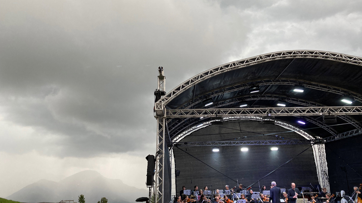 When Hirschhuber took hold of the keys for the first movement of Edvard Grieg's Piano Concerto, thunder could already be heard in the background. The interplay between Grandpa's Diandl and the Tyrolean Chamber Orchestra Innstrumenti on "Mit dir bei mir" and "Muatas Stübele" really got to the legs. And also Mozart's clarinet concerto with the soloist Werner Hangl offered wonderful listening pleasure. Meanwhile, darker and heavier clouds were moving towards the Patscherkofel, thunder and lightning were increasing. Rain jackets and umbrellas against the pattering rain!