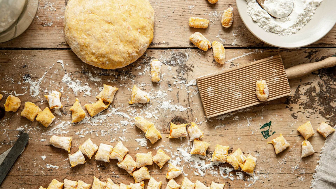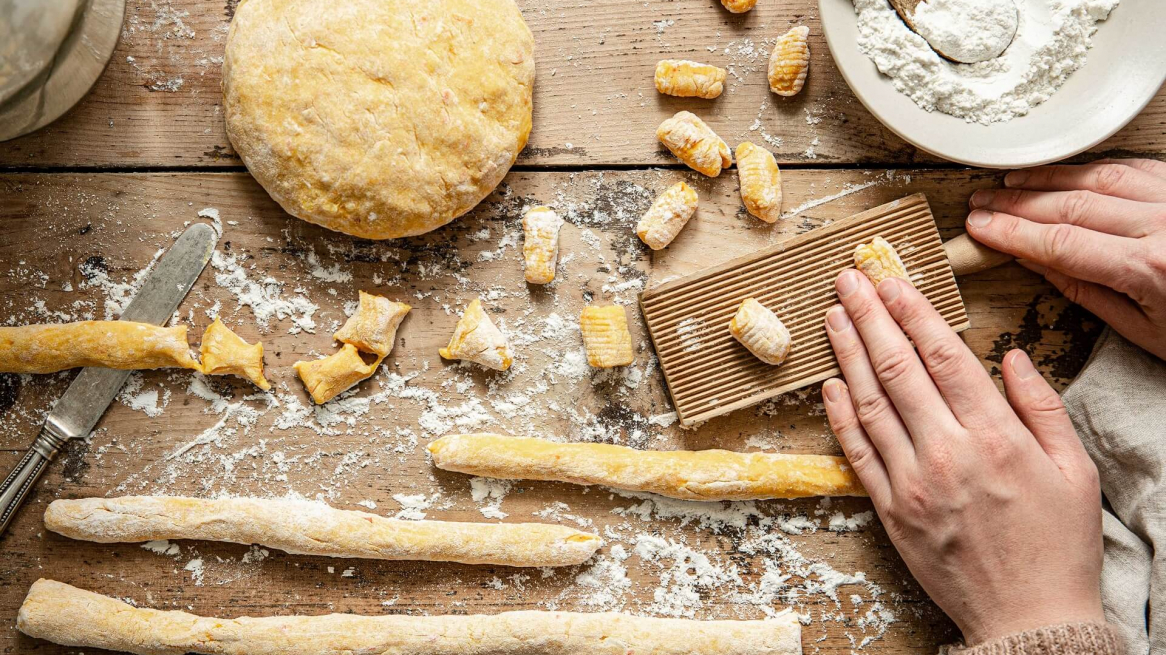 Place the dough pieces on a kitchen towel, sprinkle with a little flour, then gradually place them in boiling salted water and let them cook at a lower temperature. As soon as the gnocchi rise to the top in the water, remove them with a slotted spoon and drain well.