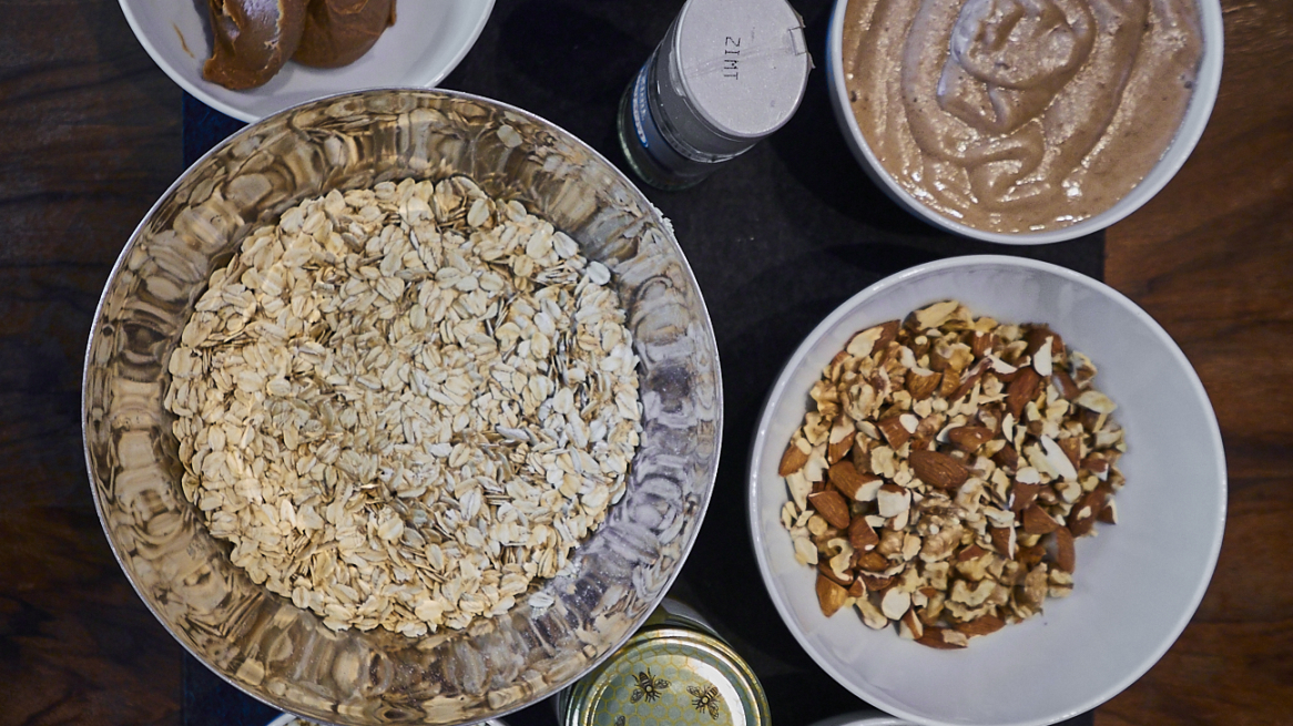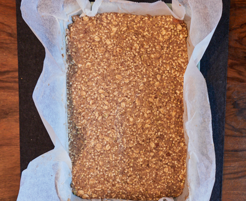 Mix all the ingredients together and place in a baking tin with baking paper. IMPORTANT: Press the mixture down firmly! Otherwise you will end up with crunchy muesli (which is not bad per se). After 25 minutes at 150° C circulating heat, remove the mixture with the baking paper from the pan and press down firmly again (it's best to use the bottom of the pan for this). Bake for another 10 minutes at top heat until golden brown.