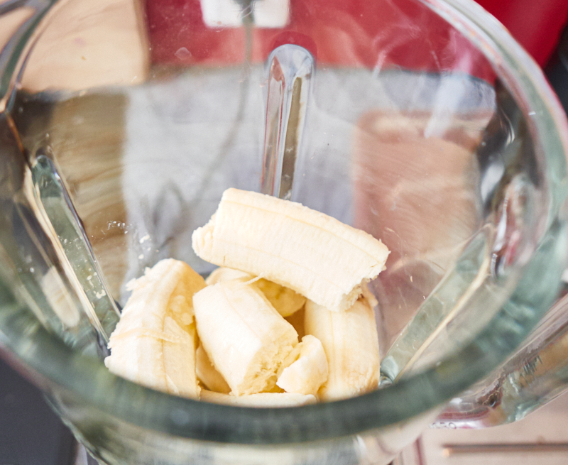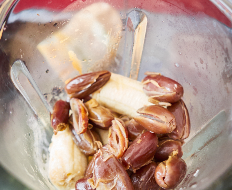Process the soft dates together with the ripe bananas and the nut butter in a blender to a creamy puree.