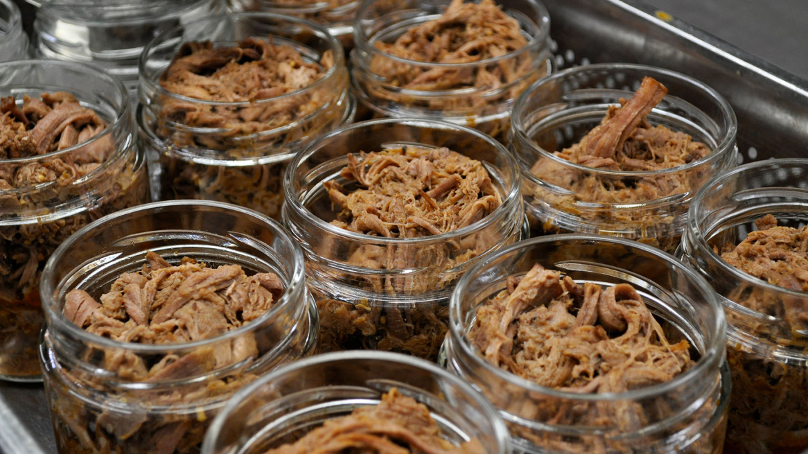 Chef Alex fills the pluck from the alpine ox into the jar. Then it is boiled down (pasteurized) and thus made durable.