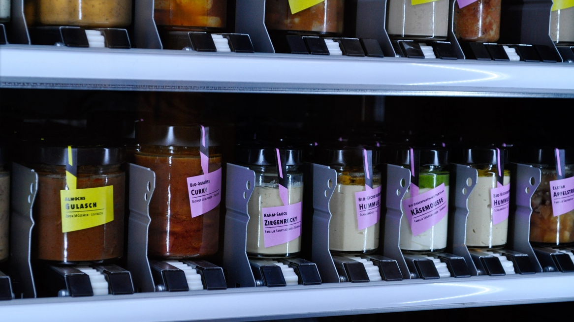 Michael Kogler not only designed the labels, but also worked his way through the tricky vending machine software. The restaurant was transformed without further ado. The various rolls of labels are piled up on the tables and manually stuck onto the jars filled by chef Alex. In the meantime, the process runs like clockwork.