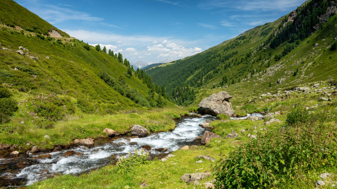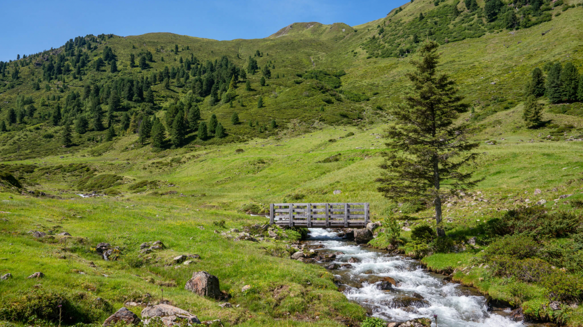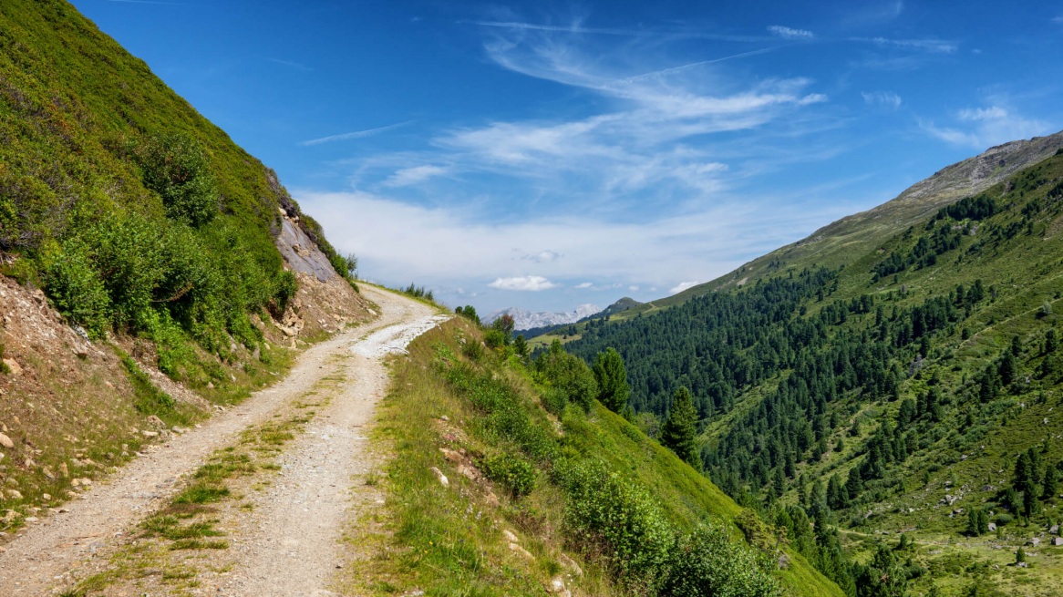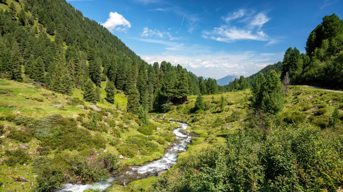 The hut circuit begins in the village centre of Sellrain. A large green sign shows the way to the Fotschertal valley. The destination is the Potsdamer Hütte, the first overnight stop. The asphalted road goes steeply uphill always along the Fotscherbach, which will accompany us steadily until shortly before the bridge. After about 20 minutes you reach the signpost towards the Potsdamer Hütte with a large information board about the hut and information about the entire hiking area. Here the asphalt road becomes a forest path and much more pleasant to walk.