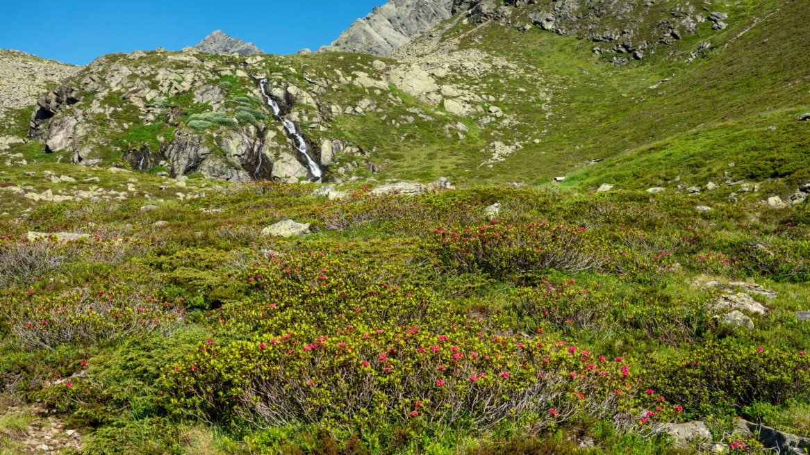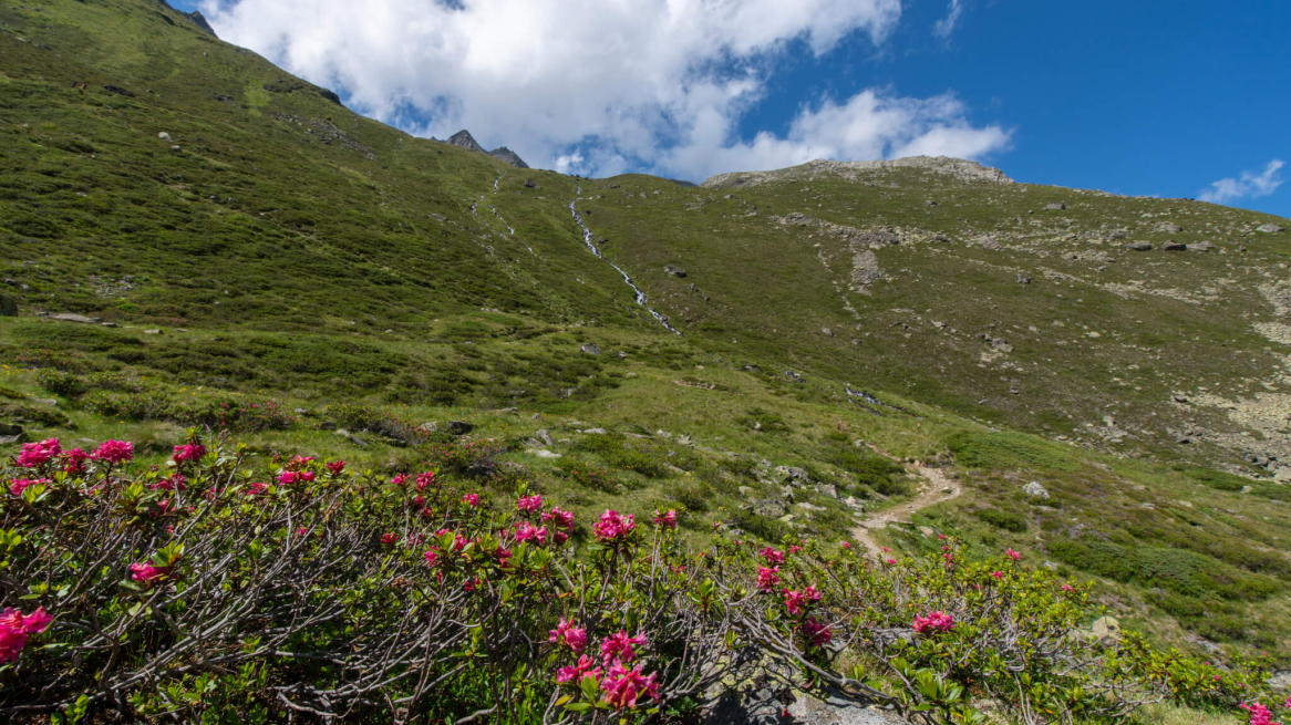 From the Bielefelder Hütte, the route is well signposted to the summit cross of the Wetterkreuzkogel, which is already visible from the hut. The path leads steeply up in serpentines, so you quickly reach the summit at 2,591 metres. From the summit, follow the ridge to the Wörgegratspitze and from there descend into the picturesque Wörgetal valley. In June you will find a sea of alpine roses and the very photogenic Pochersee. At the Pochersee (2,002m), a miners' hut has been erected, including the Pocherwerk, with a wealth of information and a small mining museum to remind you of the mining activities in the Wörgetal. The route continues in the direction of the Längentaler reservoir and from there briefly up to the destination, the Dortmunder Hütte.