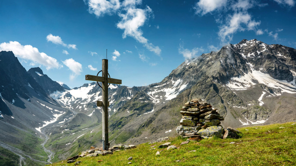 The crossing into the Gleirschtal valley takes place via the Zischgenscharte (2,936m). On the very steep path up to the Scharte, you will pass a pre-peak, the so-called Münsterhöhe (2,508m). A short detour is recommended, as the height lies off the path. An observation bench and a summit cross with a breathtaking view of the valley head of the Längental valley reward you for the detour.