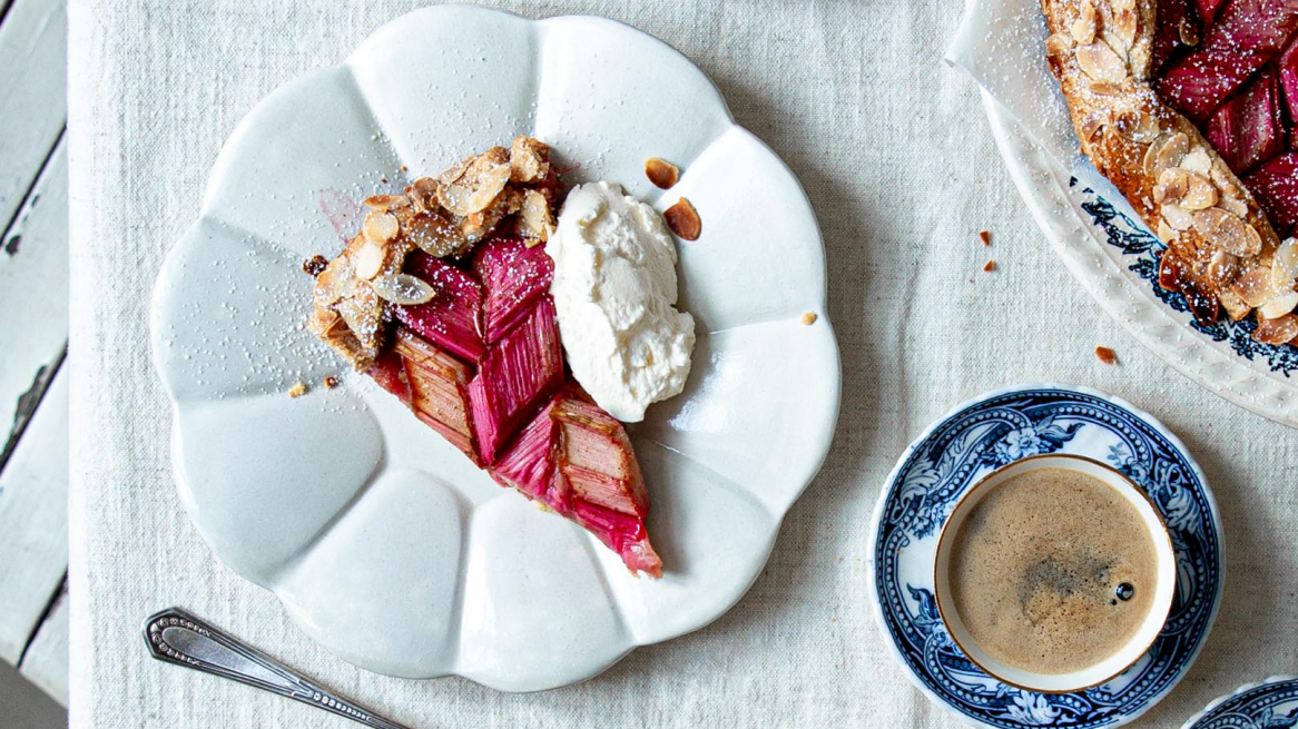 Si está motivado, puede disponer los trozos de ruibarbo en forma de diamante en el centro de la galette, dejando unos cuatro centímetros hasta el borde. A continuación, dobla el borde sobre los trozos de ruibarbo y extiende un poco de nata montada por encima. A continuación, espolvorear con almendras laminadas y un poco de azúcar.