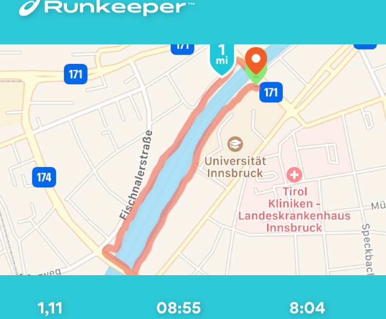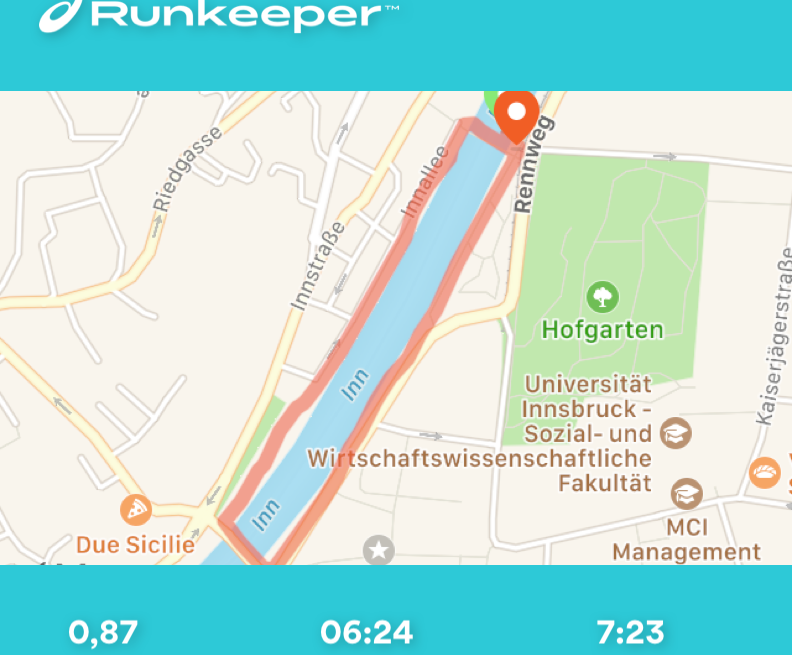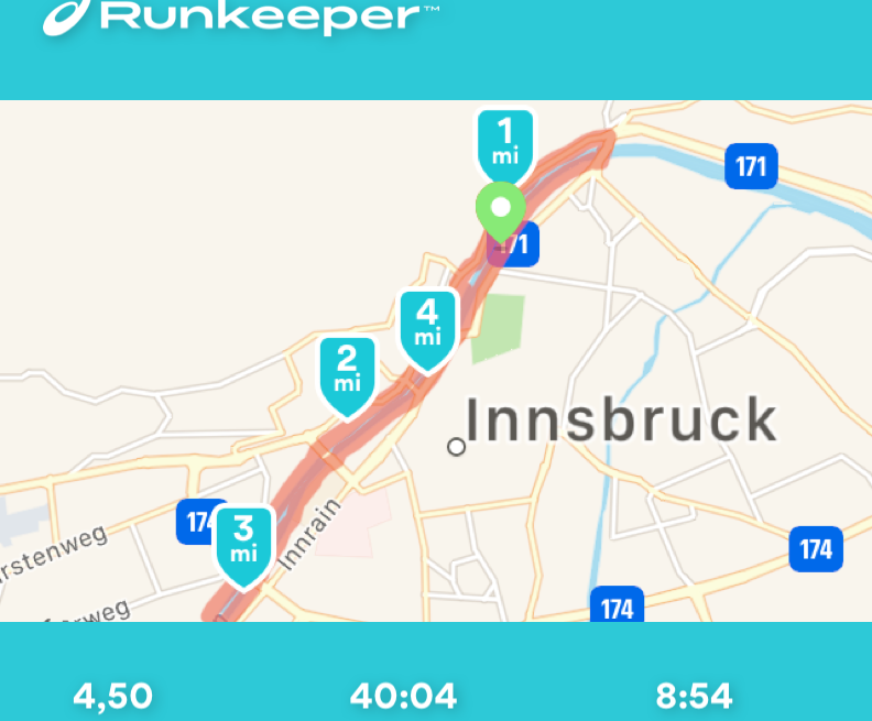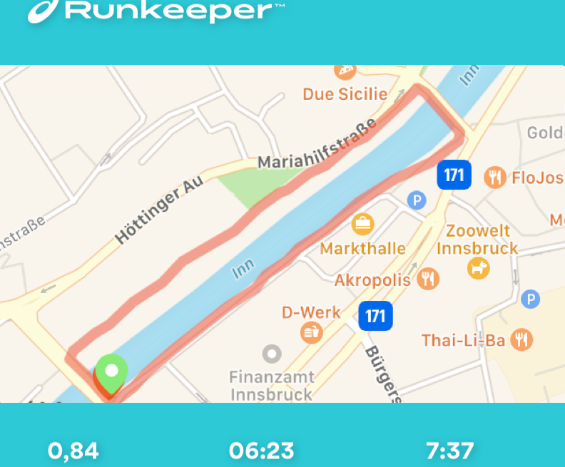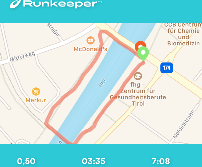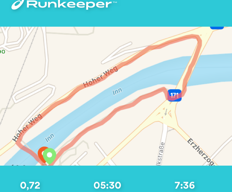 Así que, ¡ahora a juntar todo! Empecé y terminé la "carrera de carreras" fuera de la estación Löwenhaus del Hungerburgbahn, dirigiéndome hacia el oeste hasta el Mühlauer Brücke, para quitar los tramos más desagradables de la carretera antes. Hay que tener en cuenta que con este recorrido hay que cruzar la carretera en el Innbrücke. Tuve la suerte de que el semáforo estaba en verde las dos veces. Puedes correr por los senderos bajo los otros puentes de la carretera. Hacía tiempo que no hacía una carrera larga (dame un respiro... ¡7,2 kms es largo para mí!) así que tengo que admitir que me costó un poco. Como se puede ver teniendo en cuenta mi ritmo lento. Aun así, mientras la lluvia me ayudaba a refrescarme en el tramo final, sentí la satisfacción de haber hecho este circuito por primera vez.