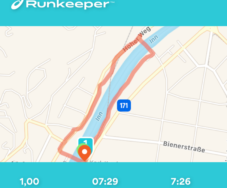Así que, por curiosidad sobre las distancias, recientemente descargué el Aplicación Runkeeper y corrí los seis circuitos creados por los siete puentes sobre el Inn más cercanos al centro de la ciudad. Y luego, una vez terminados los recorridos de entrenamiento, los puse juntos para la gran carrera