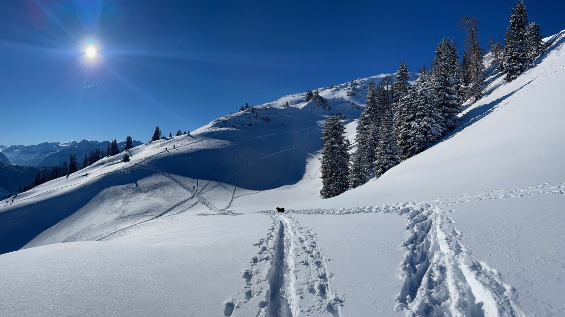 Una excursión de esquí súper segura incluso en lo más profundo del invierno con un nivel de alerta de avalanchas 4. En el descenso, como siempre en la montaña, hay que tener cuidado con las pendientes en las que se entra. Si sigues las pistas estándar y te mantienes a la izquierda, estás en el lado seguro.
