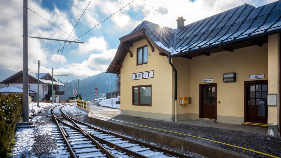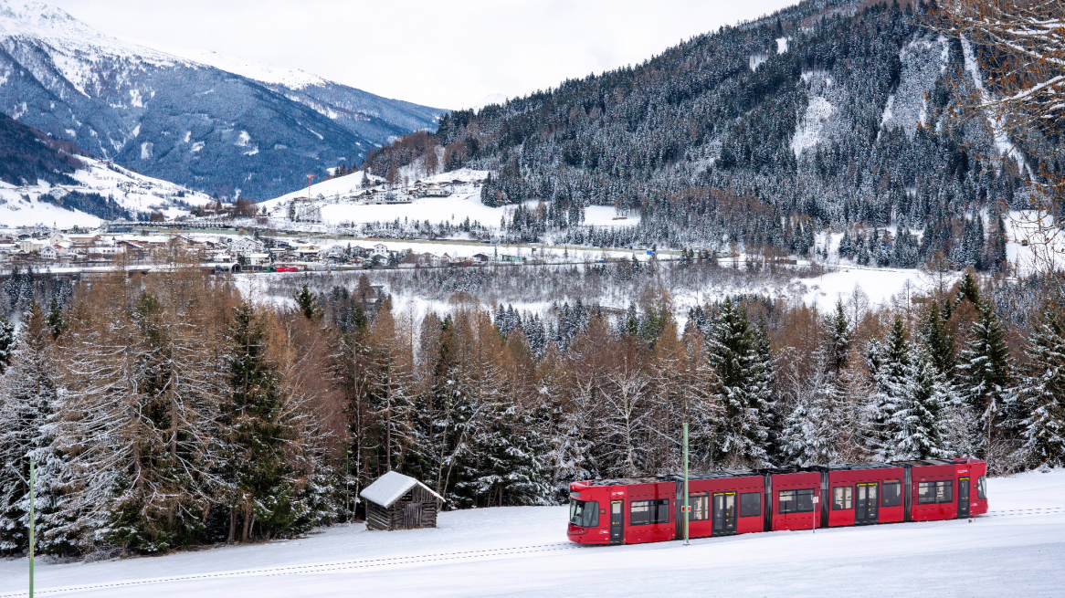 Ce qui est bien avec ce sentier hivernal, c'est que l'on peut remonter dans le tram à tout moment et raccourcir la randonnée quand on en a assez. Il passe en permanence devant les stations du Stubailtalbahn. La gare de Kreith est en outre la fin de la ligne partagée. Cela signifie qu'à partir d'ici, on pourrait même prendre un train toutes les 30 minutes pour retourner à Innsbruck.