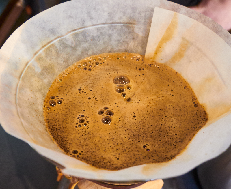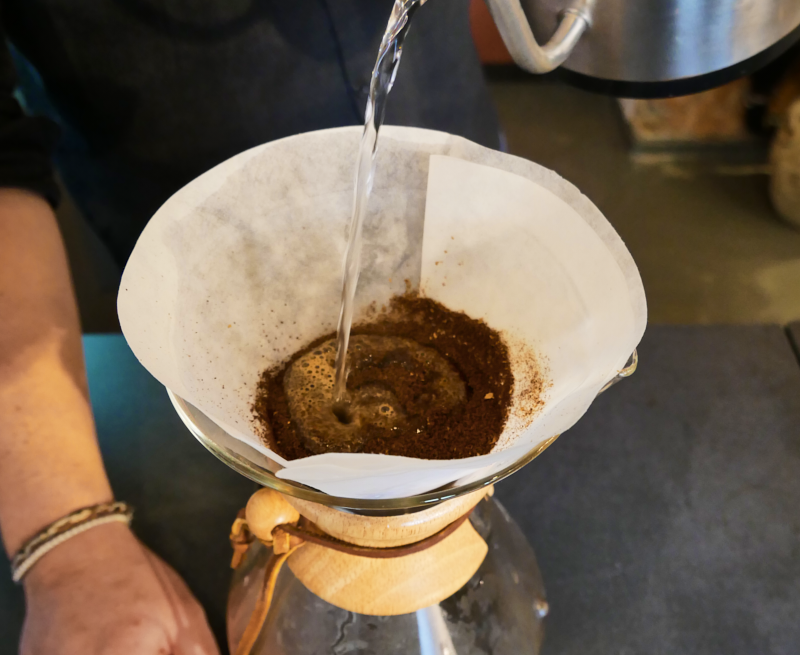 - Metti il caffè macinato nel filtro di carta e versa un po' d'acqua con un movimento circolare - aspetta che le bolle siano sparite.