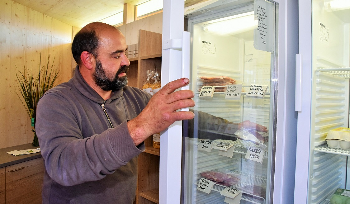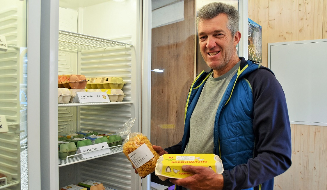 "Momenteel zijn we met z'n vijven," vertelt Herbert Miller, voorzitter van ARGE Ellbögner Bauernladen. Het is verbazingwekkend dat het assortiment zo breed kan zijn, denk ik bij mezelf en inspecteer rekken vol pasta, eieren, melk, thee, kruiden, aardappelen, spek, worsten, Kaminwurzen en een behoorlijke selectie vlees. Groenten zullen volgen - ze worden al verbouwd op de zonnige velden.
