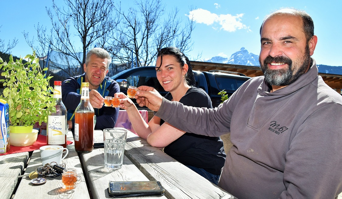 Daarna gaan we in detail in op het pekelen, de juiste temperatuur en andere trucs voor het succes van de bekende Tiroolse lekkernij. Na zoveel gepraat, gaan we eindelijk over tot de proeverij. Het oordeel is duidelijk: sensationeel! Natuurlijk nam ik meteen een stuk mee naar huis. Kaminwurzen en brood ook. En natuurlijk mocht de verplichte schnaps ook niet ontbreken 🙂