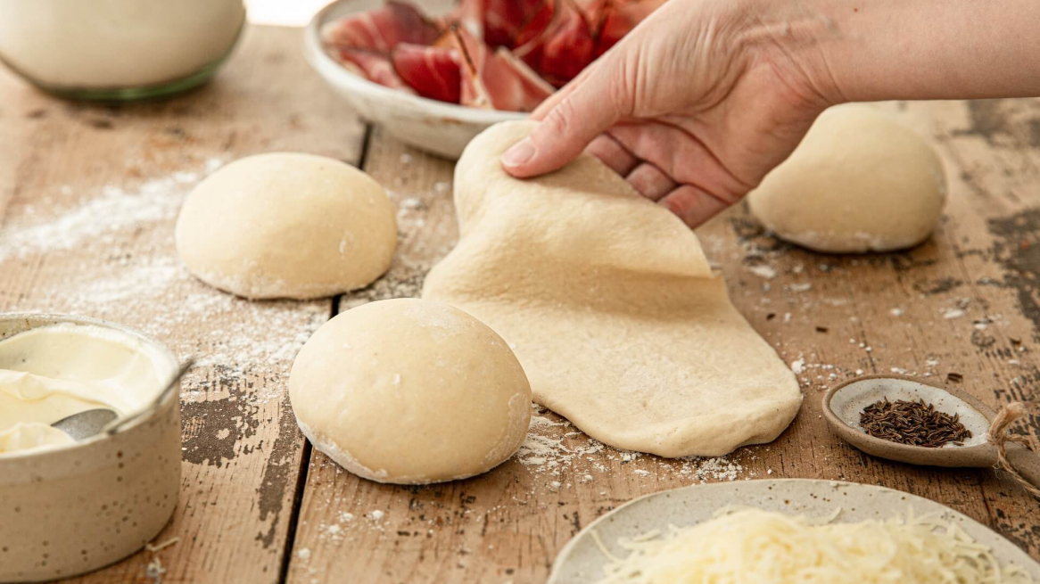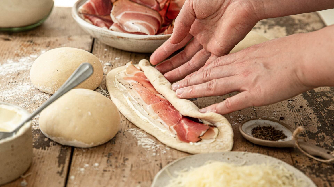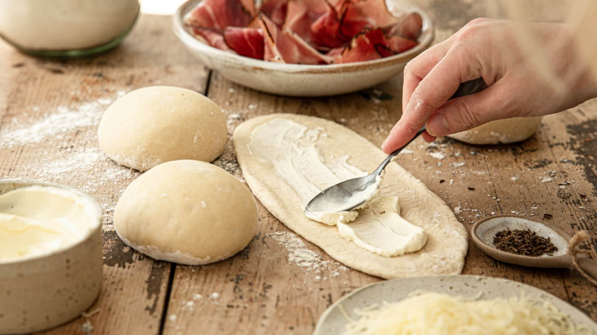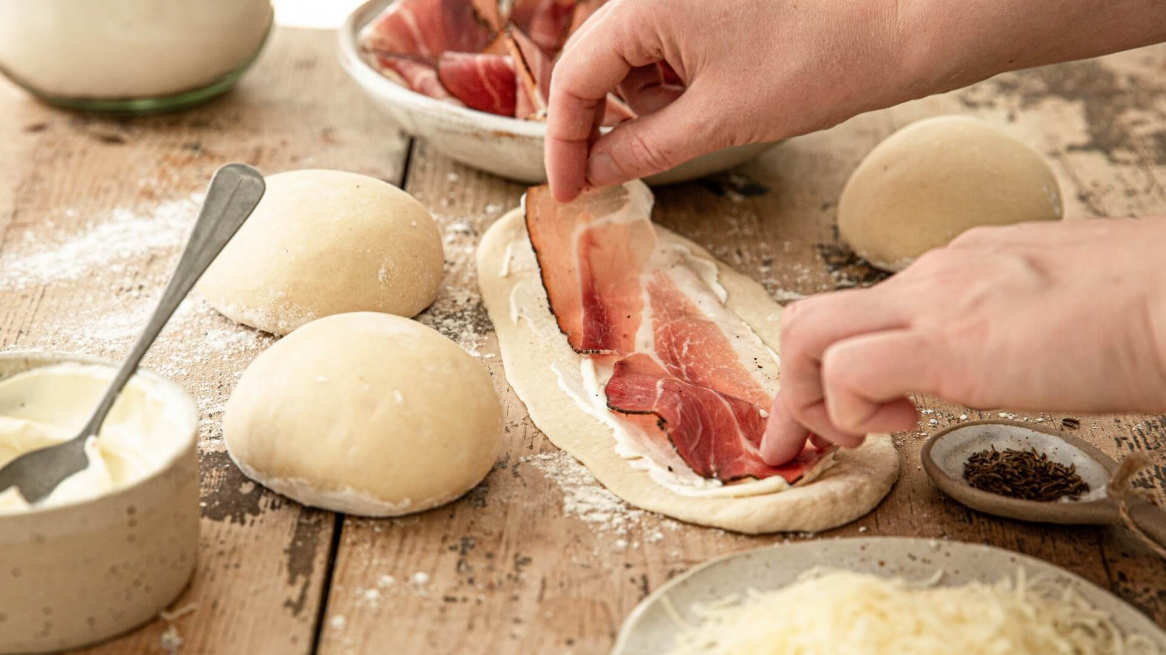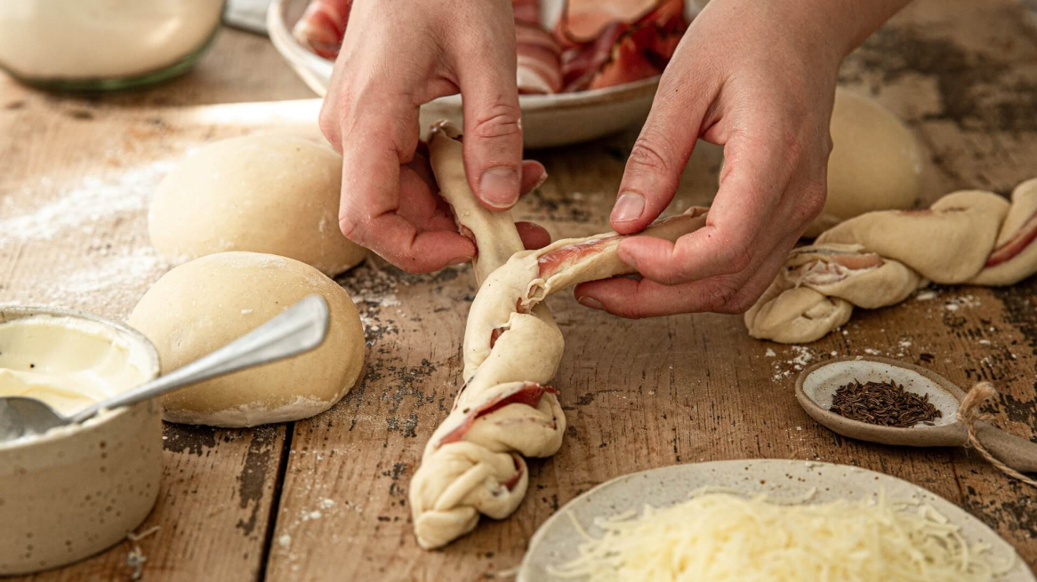 Verdeel het deeg in tien stukken van elk 80 gram en vorm er balletjes van. Laat de balletjes nog vijf tot tien minuten rijzen en rol ze vervolgens uit tot een langwerpige vorm (ongeveer tien centimeter breed). Besmeer met een beetje crème fraîche, leg er een plakje spek op en rol op vanaf de lange kant. Snijd de rol doormidden en draai de twee delen in elkaar.