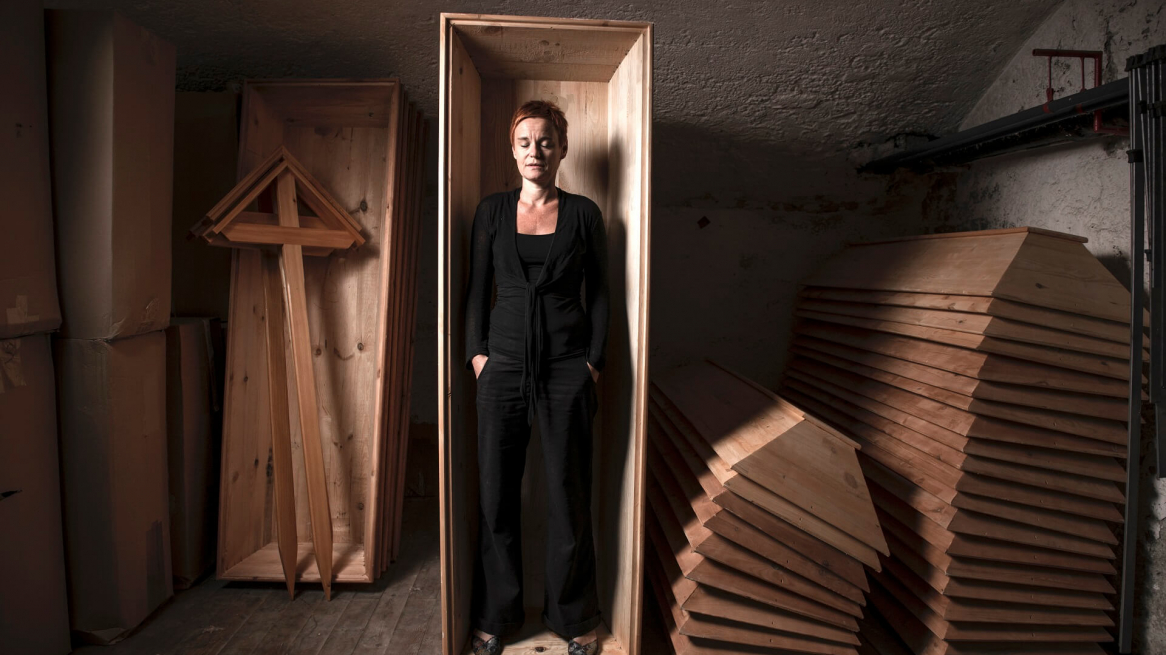 Christine Pernlochner-Kügler is de naam van de vrouw die Facebook had altijd mijn aandacht getrokken. Iedereen die haar site voor de eerste keer bezoekt, wrijft verbaasd in zijn ogen. Haar profielfoto toont haar - omringd door opgestapelde doodskisten - staand in een doodskist met haar ogen gesloten. Dit komt door haar beroep: Ze is een begrafenisondernemer in Innsbruck.