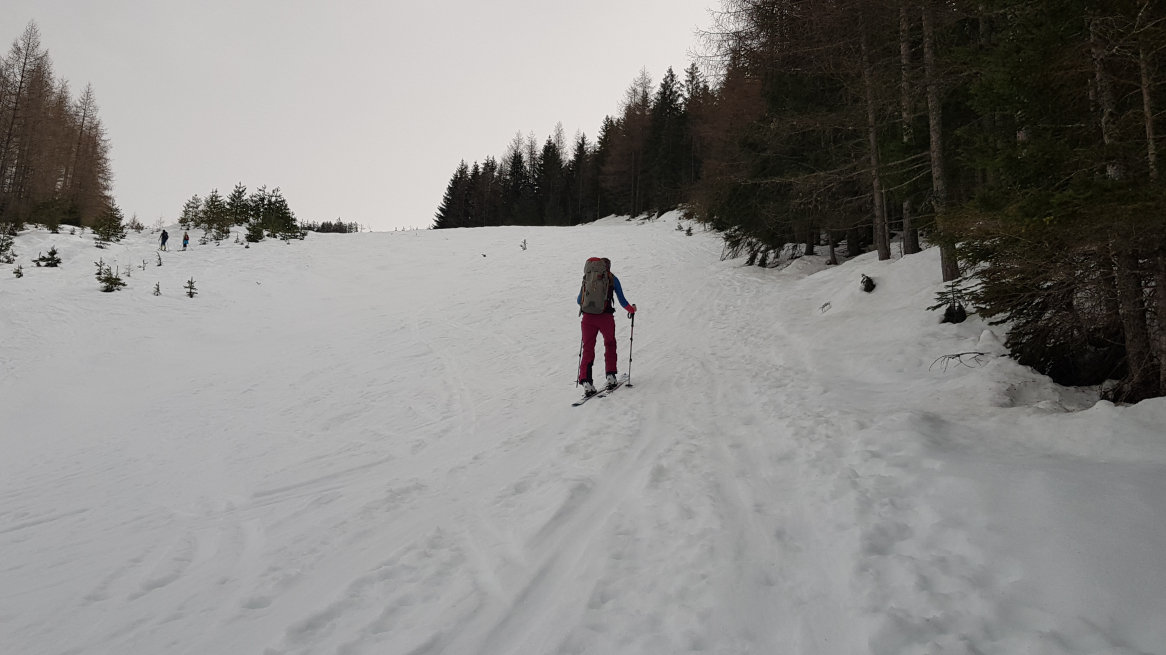 Het startpunt van de skitocht is in Obsteig op de grote parkeerplaats van de voormalige Grünberglift. We komen er rond 11.30 uur aan en vinden een vrije plaats omdat de eerste wintersporters al klaar zijn met hun activiteit. Als de parkeerplaatsen vol zijn, kunt u uw voertuig verderop bij het sportveld parkeren. We starten direct bij Kinderland Grünberg en lopen langs de beek in de richting van de niet meer gebruikte skipiste. De eerste piste is analoog aan de skitocht op de Simmering: bij de tweede kruising van de rodelbaan volgen we niet de rodelbaan, maar slaan we linksaf de skipiste op. Vanaf dan zijn we bijna alleen. Want naast de rodelaars trekken ook talrijke skitoerers naar de Simmeringalm.